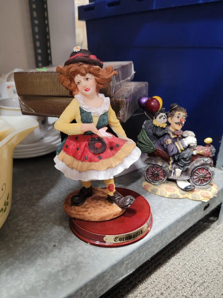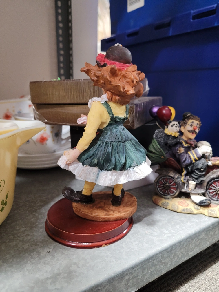 Charming figurine of a little clown girl. Detailed paint job. Rests on a small, round base. Collectible or decorative piece. Pre-owned.
