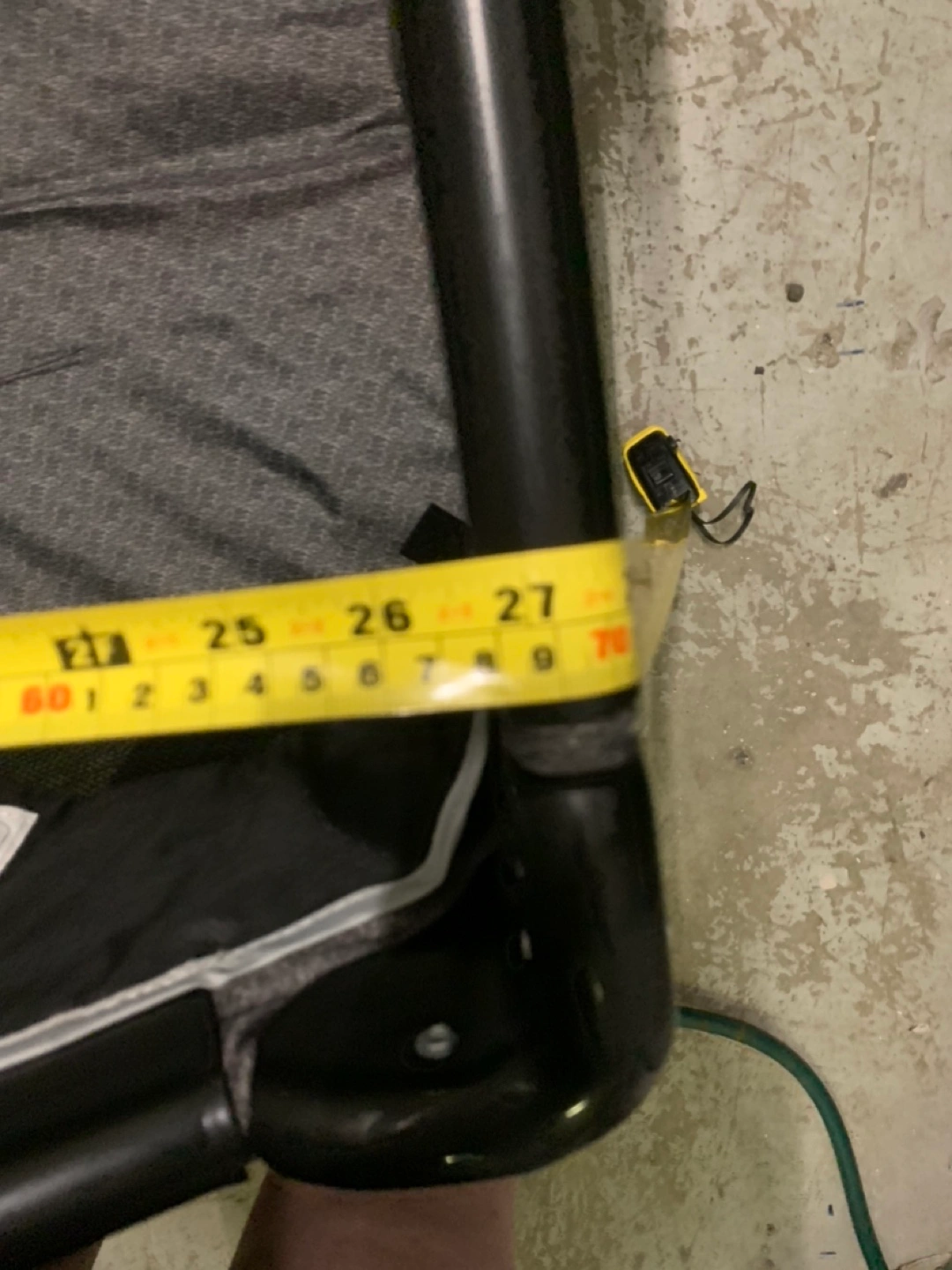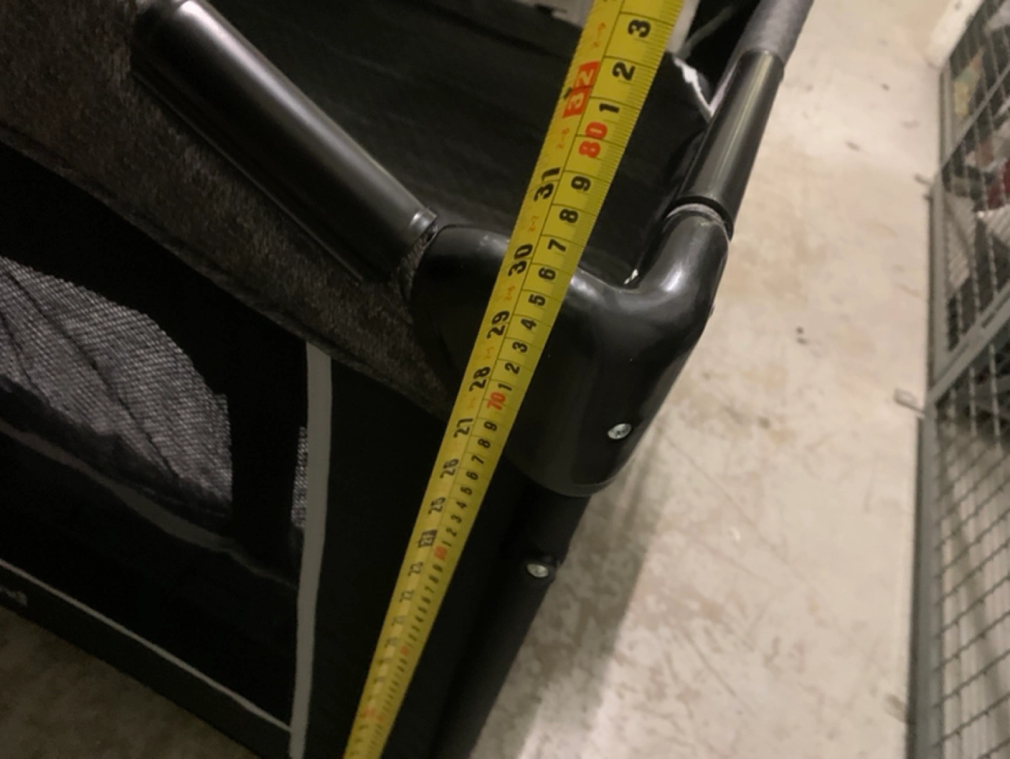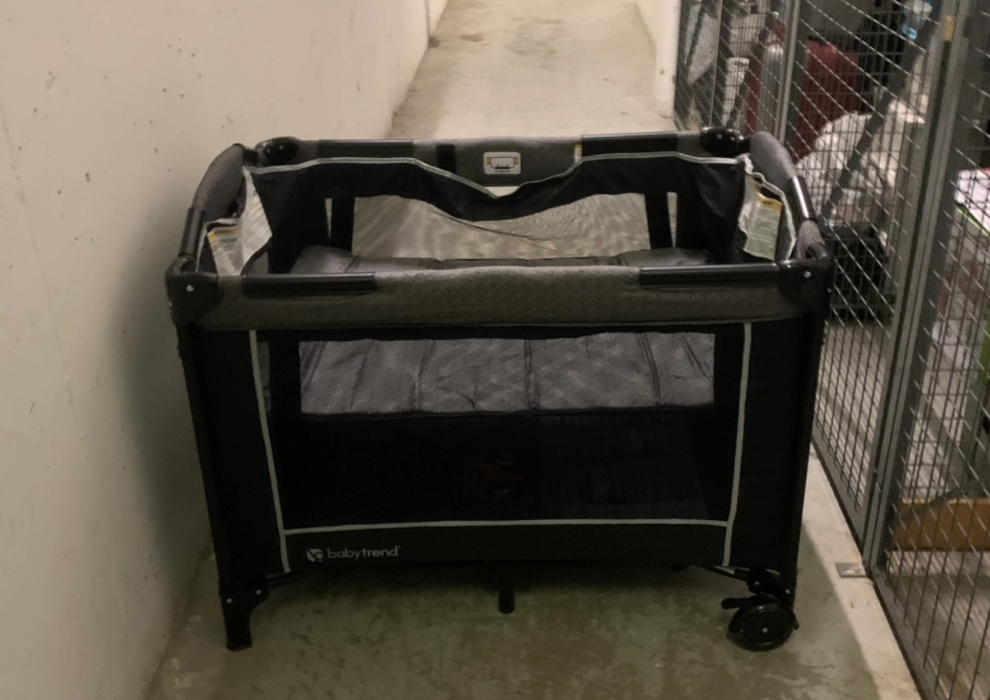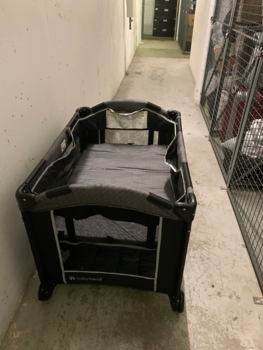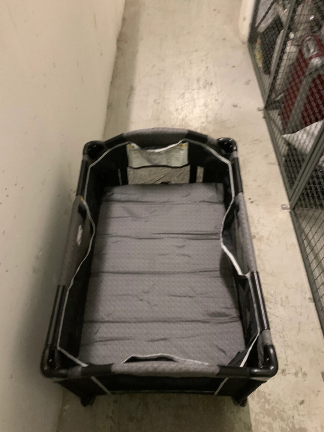 Portable playard, grey and black.