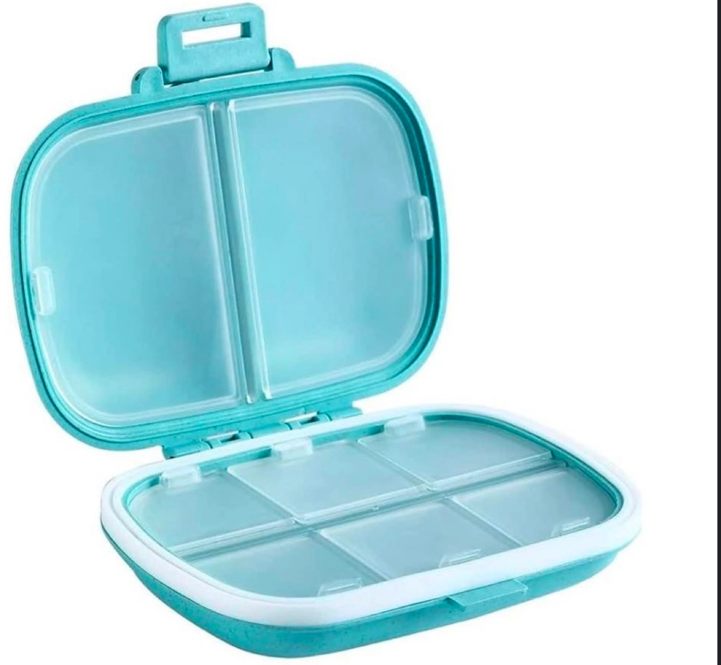 Seven-compartment pill organizer. Lightweight and easy to carry. Perfect for travel or everyday use. Features a snap closure.