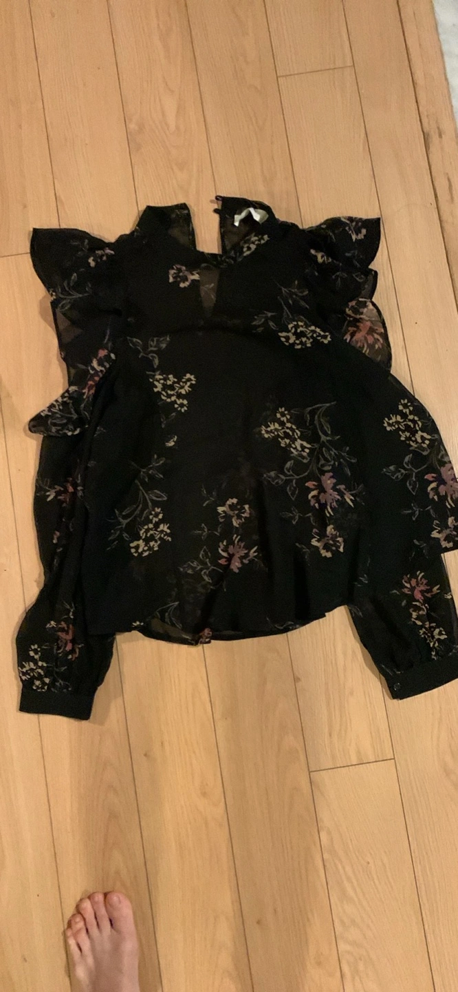 Black sheer short sleeve blouse. Features ruffle detailing on the shoulders and a floral print throughout. Lightweight fabric.