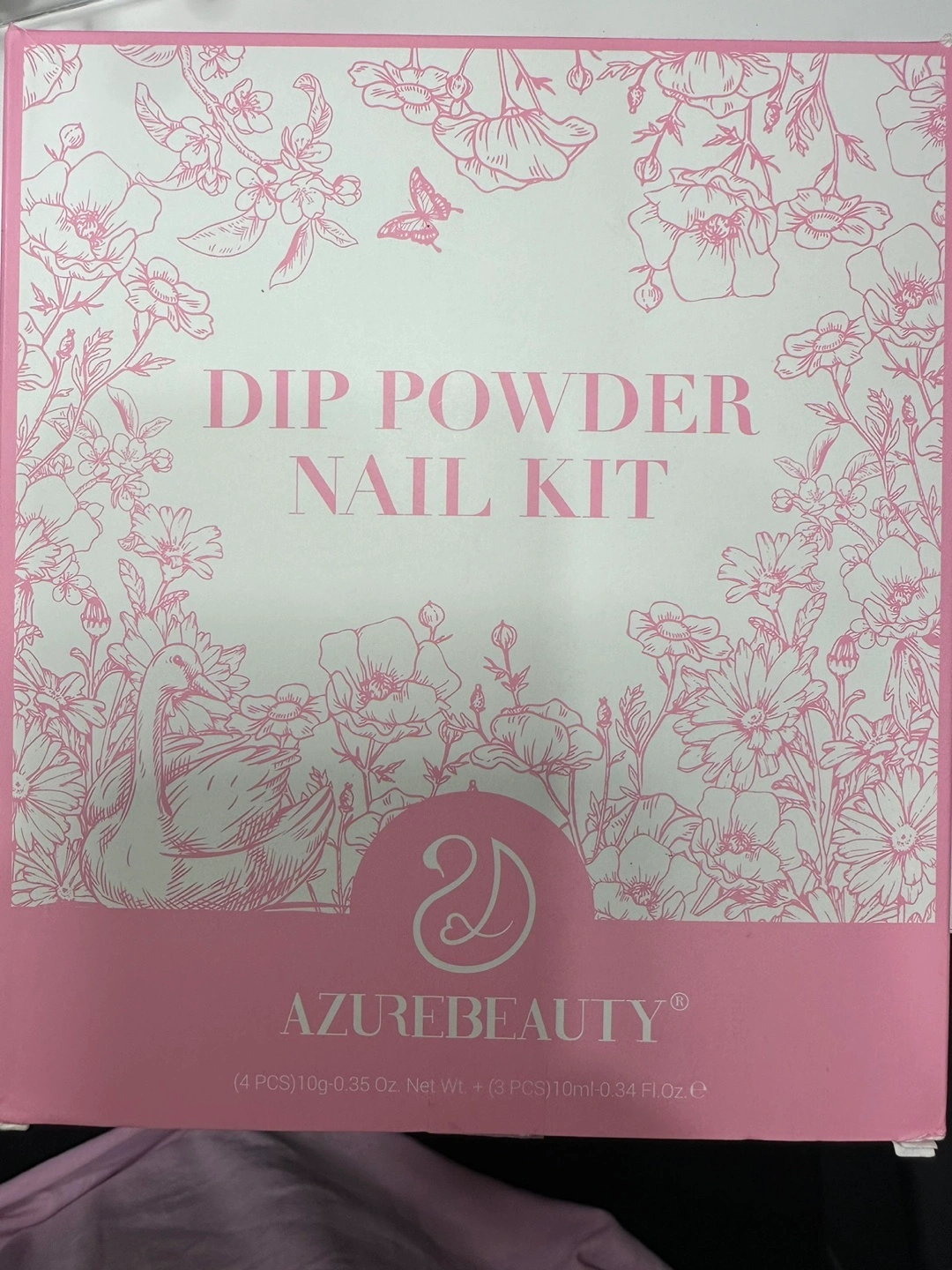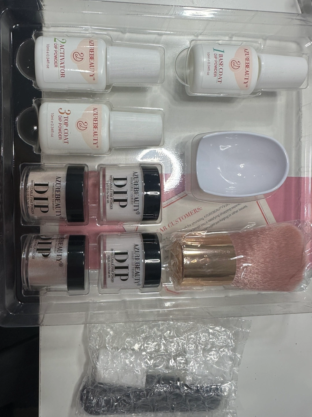 New Azurebeauty dip powder nail kit. Includes four dip powders, base coat, activator, top coat, and brush. Everything needed for a beautiful manicure.