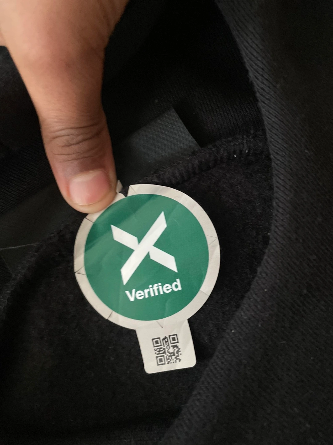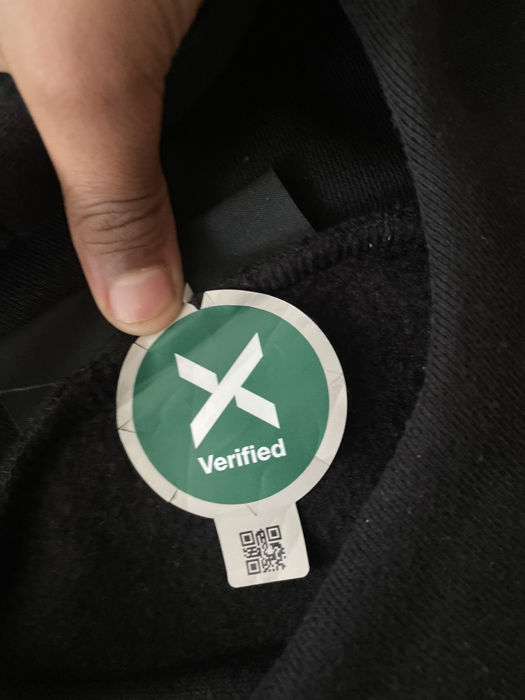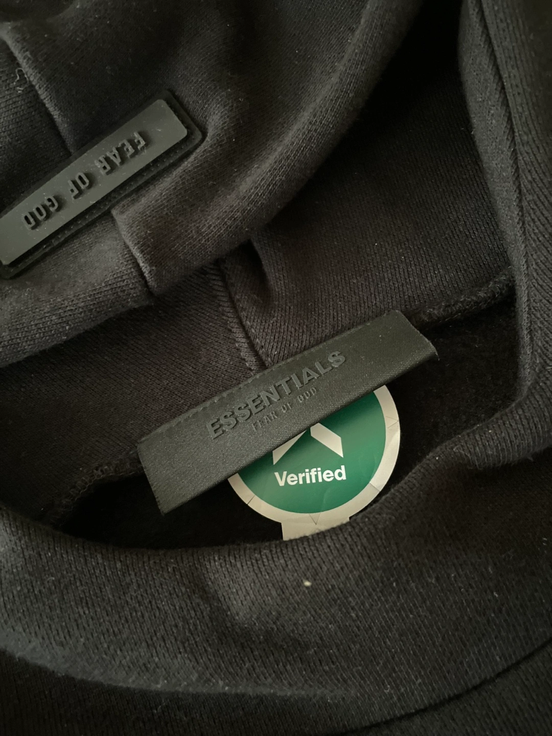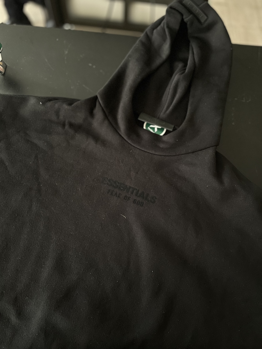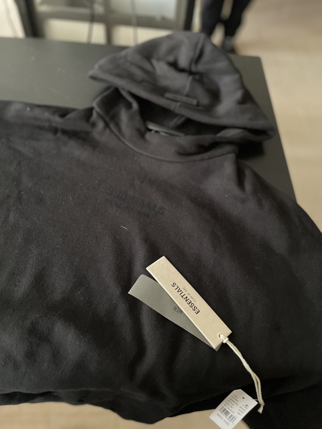 Black pullover hoodie. Features a small logo on the chest. Includes original packaging. Excellent condition.