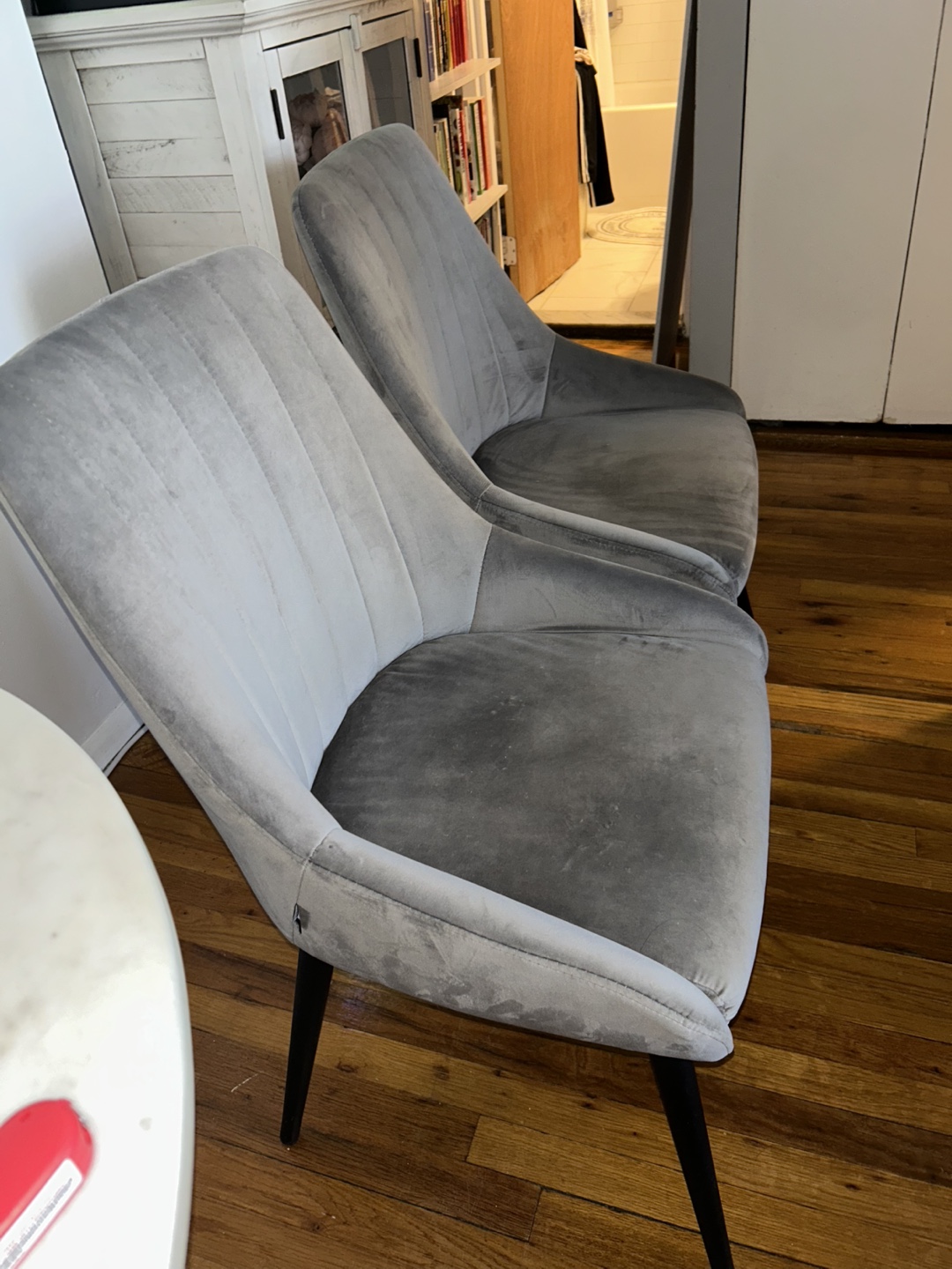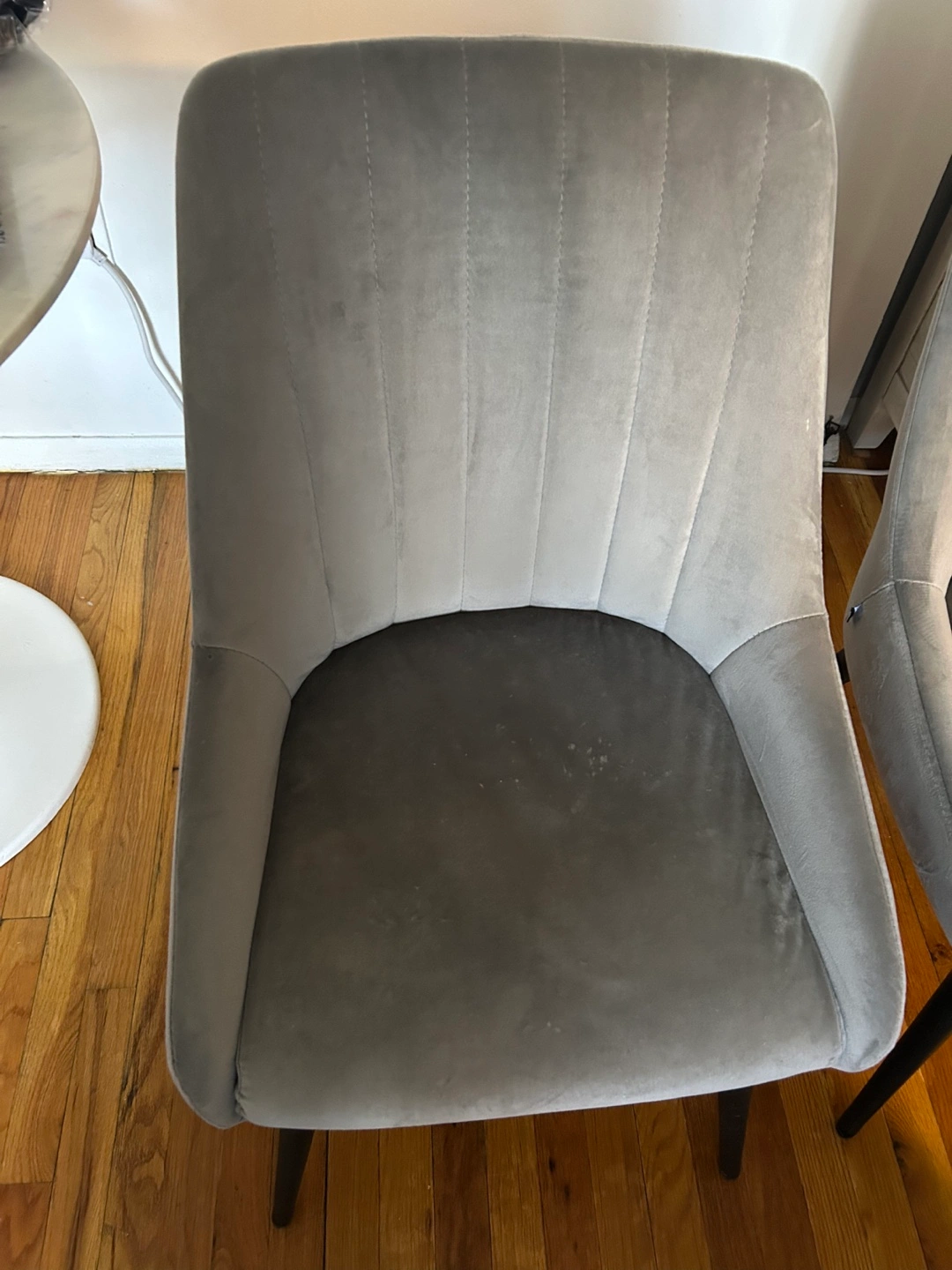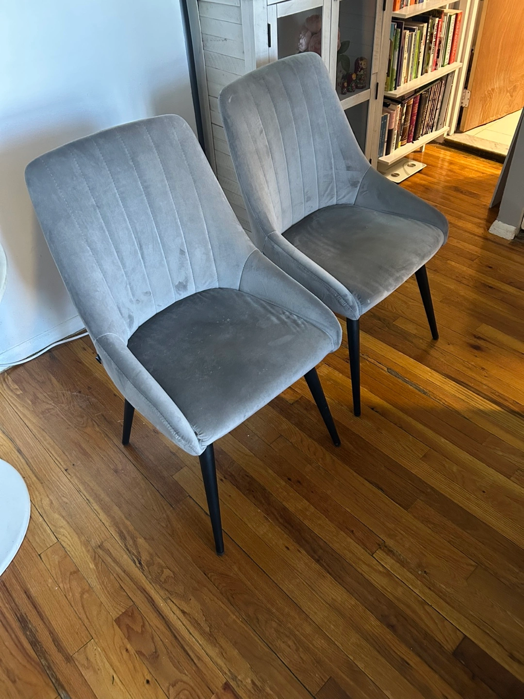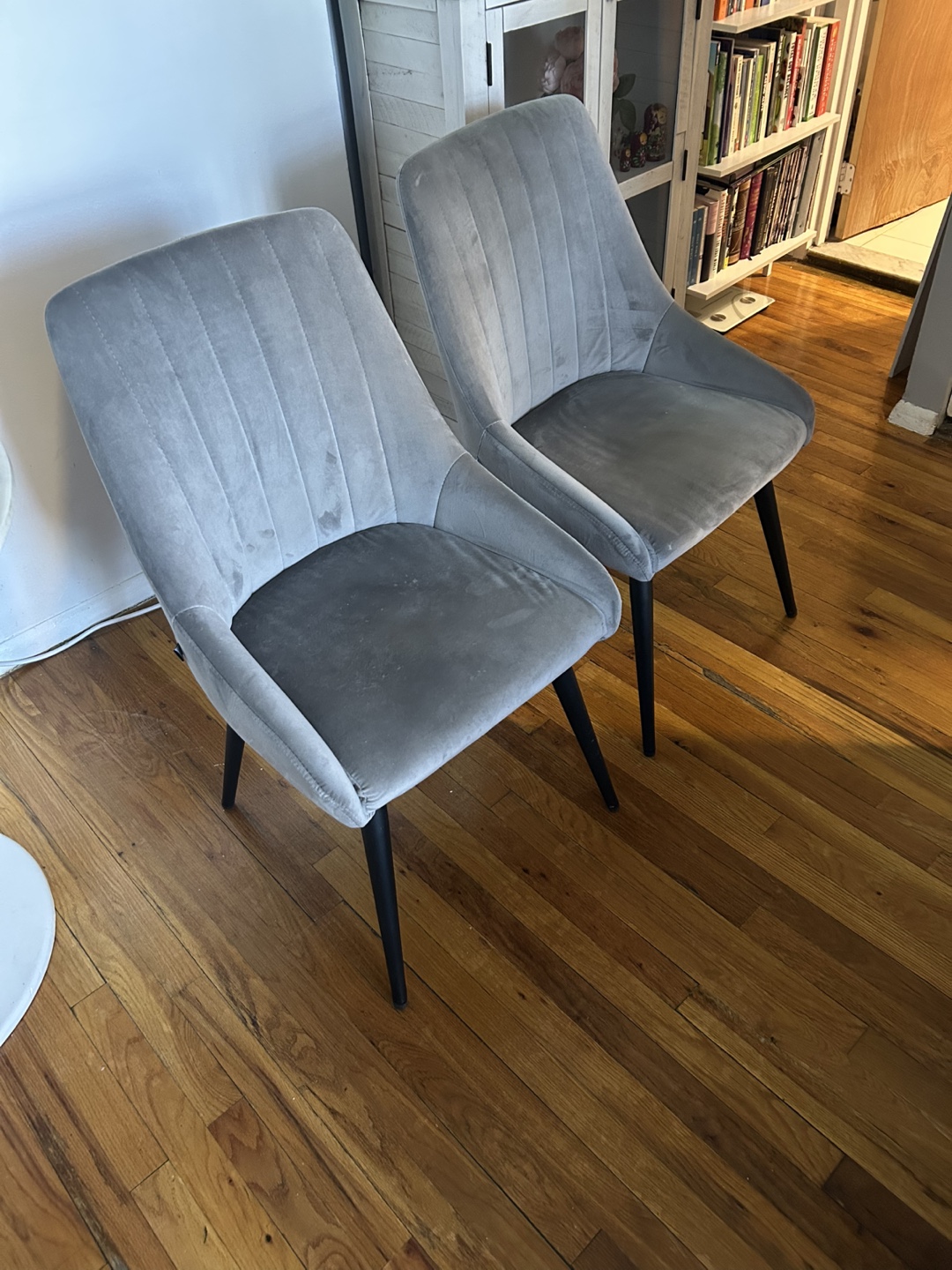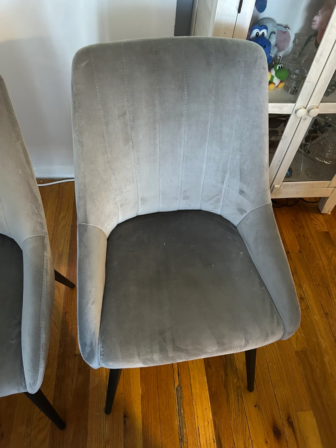 Two gray velvet dining chairs. Channel-tufted backs. Black tapered legs. Minimal wear.