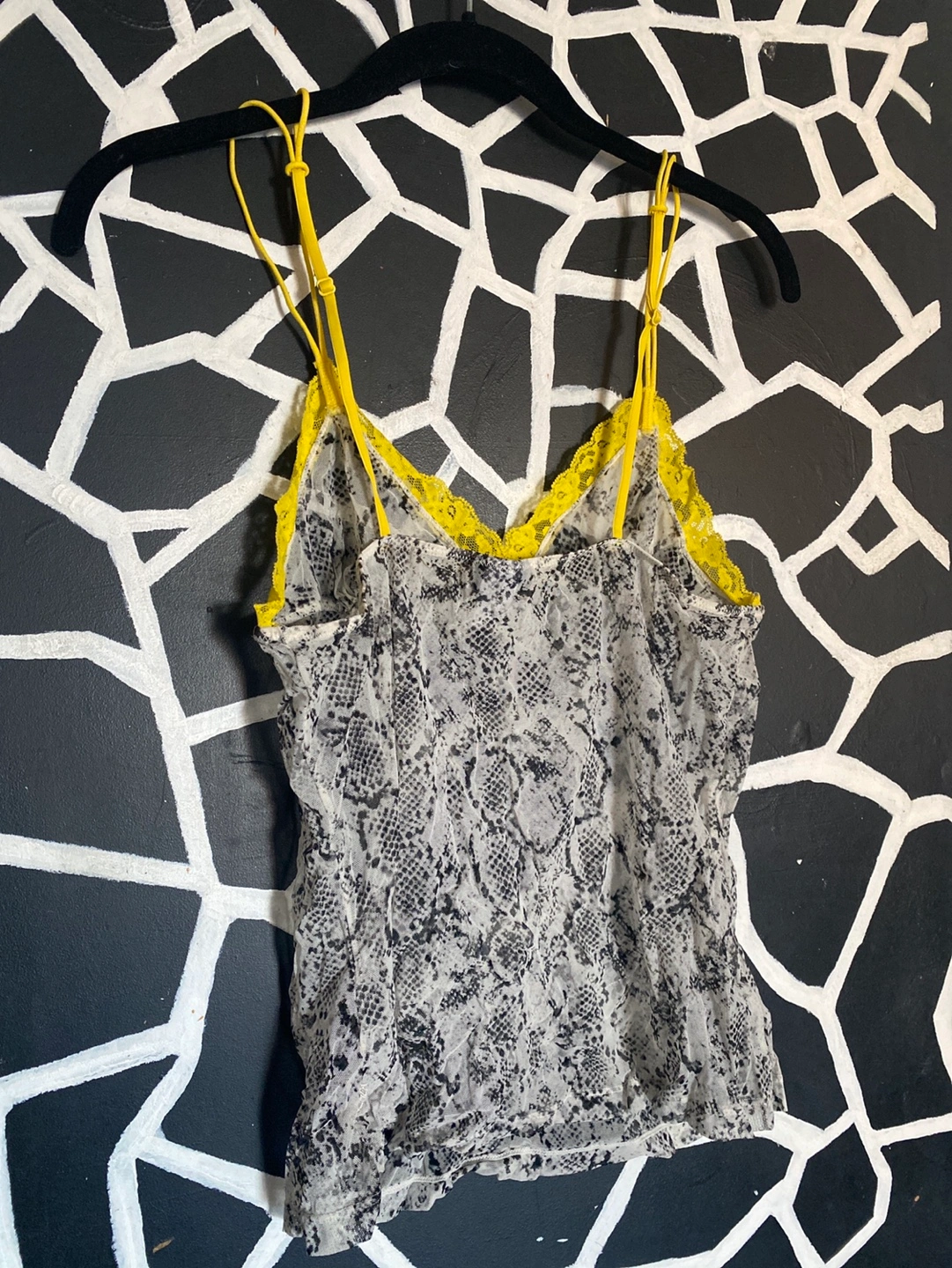 Grey and black snakeskin print with yellow lace trim. Adjustable straps. Sheer fabric.