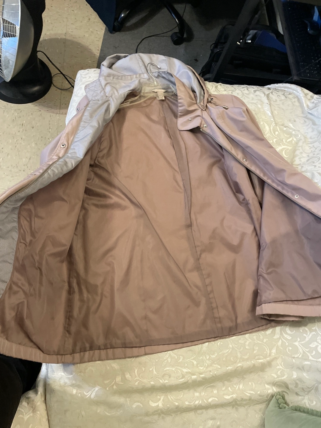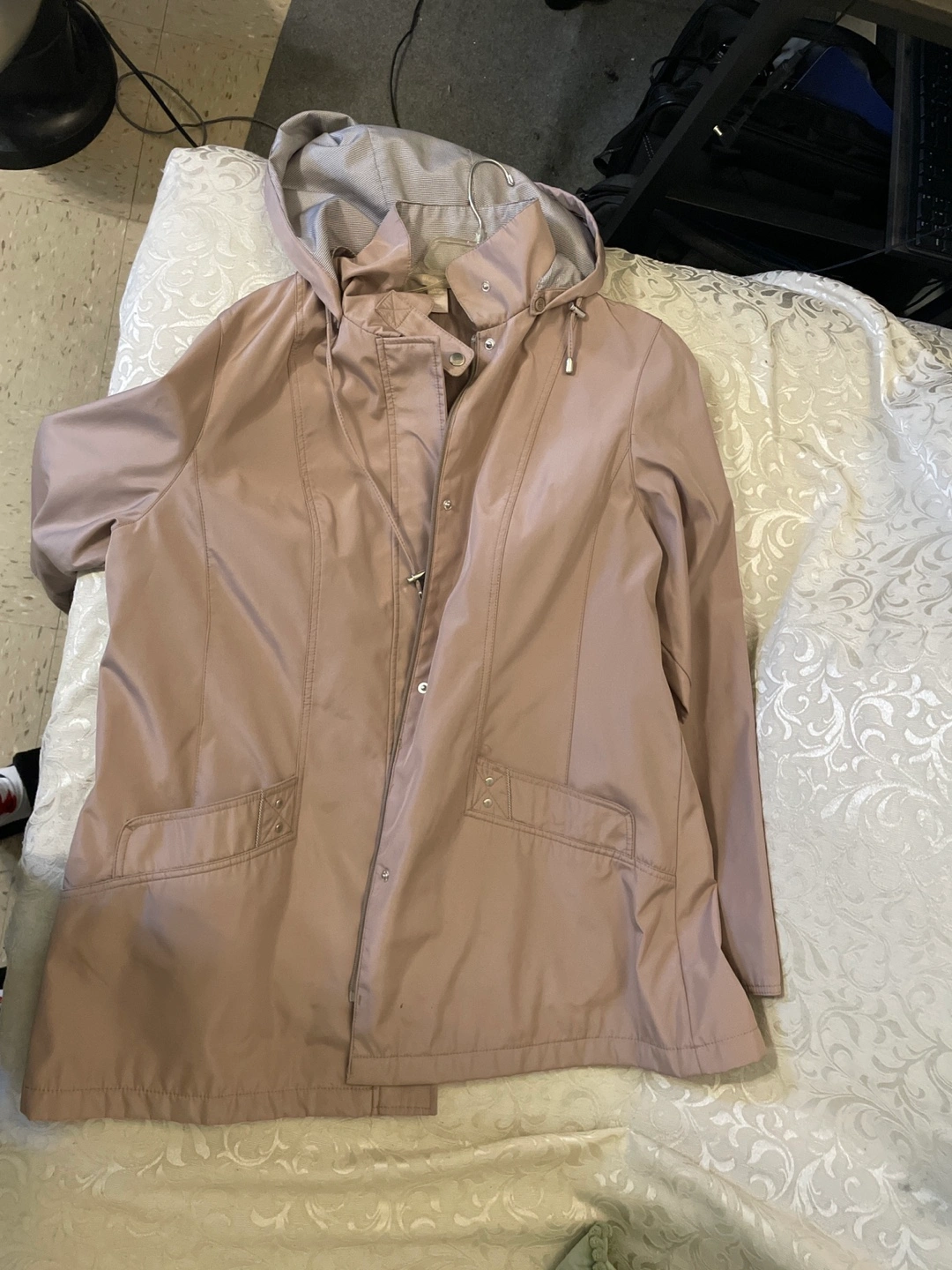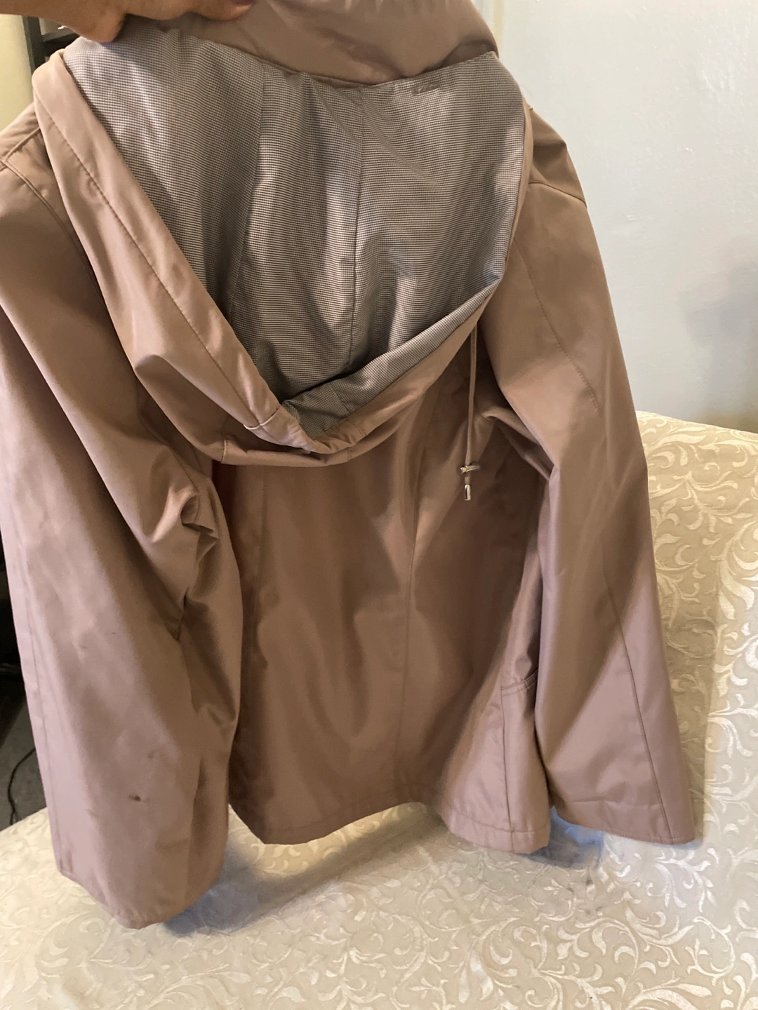 475Women's mauve hooded jacket. Size 18W-20W. Features a snap closure and pockets. 100% polyester shell and lining.