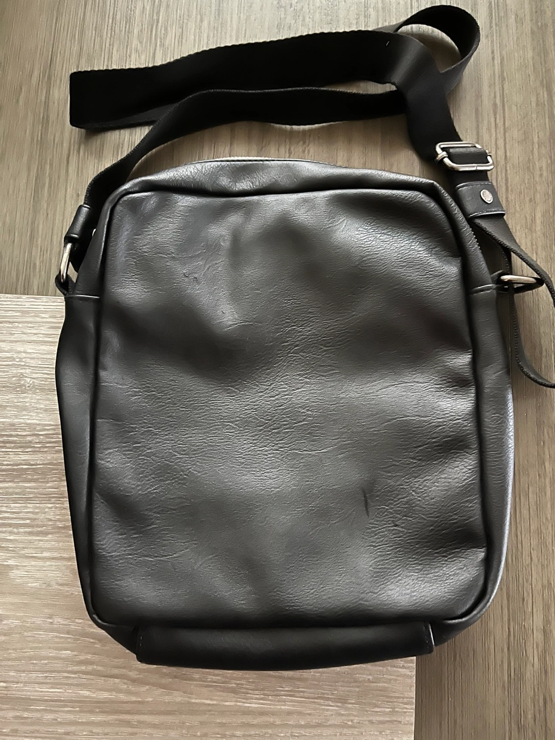 Black crossbody bag. Adjustable strap. Zipper closure. Small front zipper pocket. Embossed brand logo.