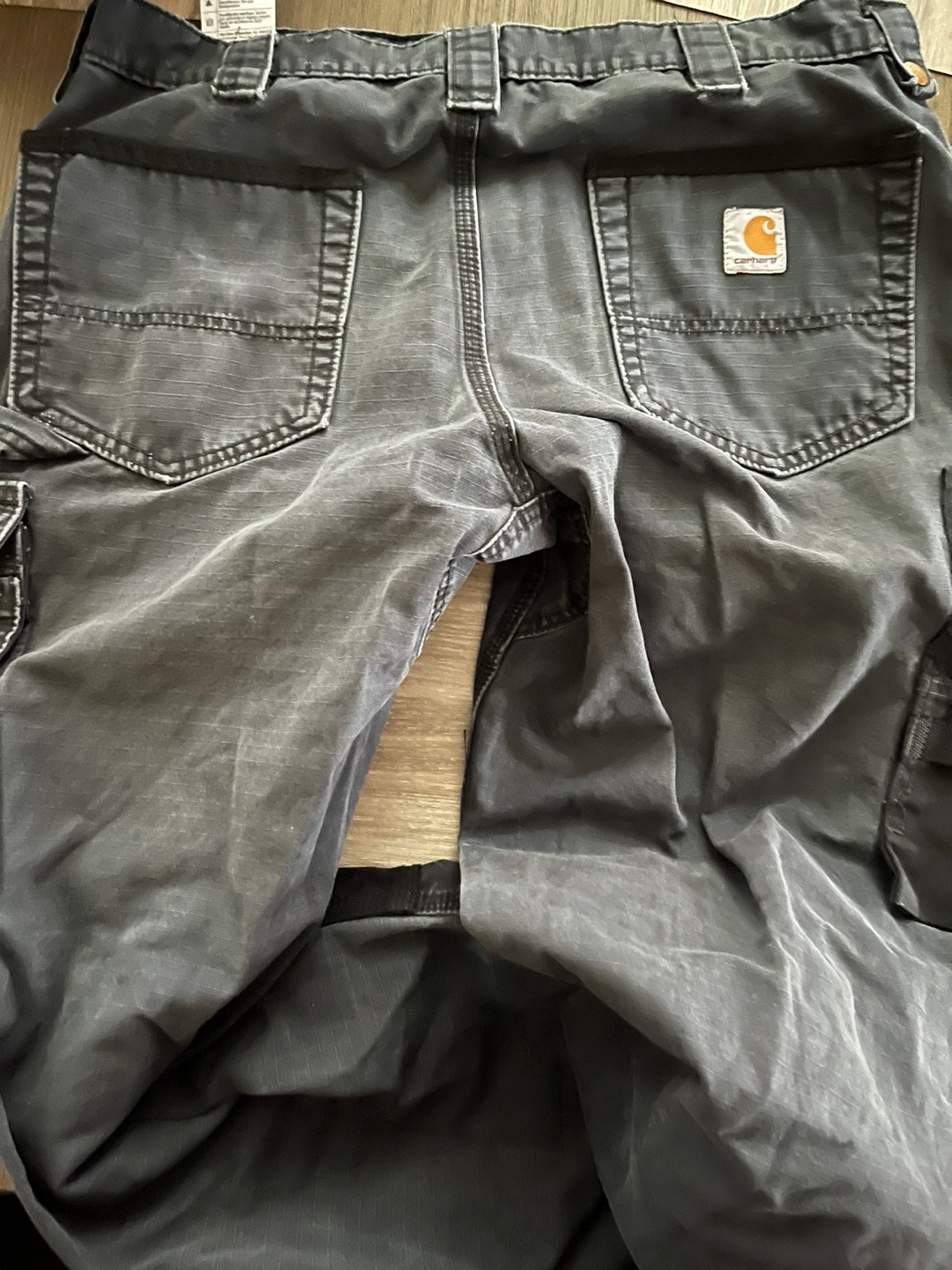 Men's Carhartt cargo pants. Relaxed fit. Size 33x32. Dark grey and black. Multiple pockets. Good condition.