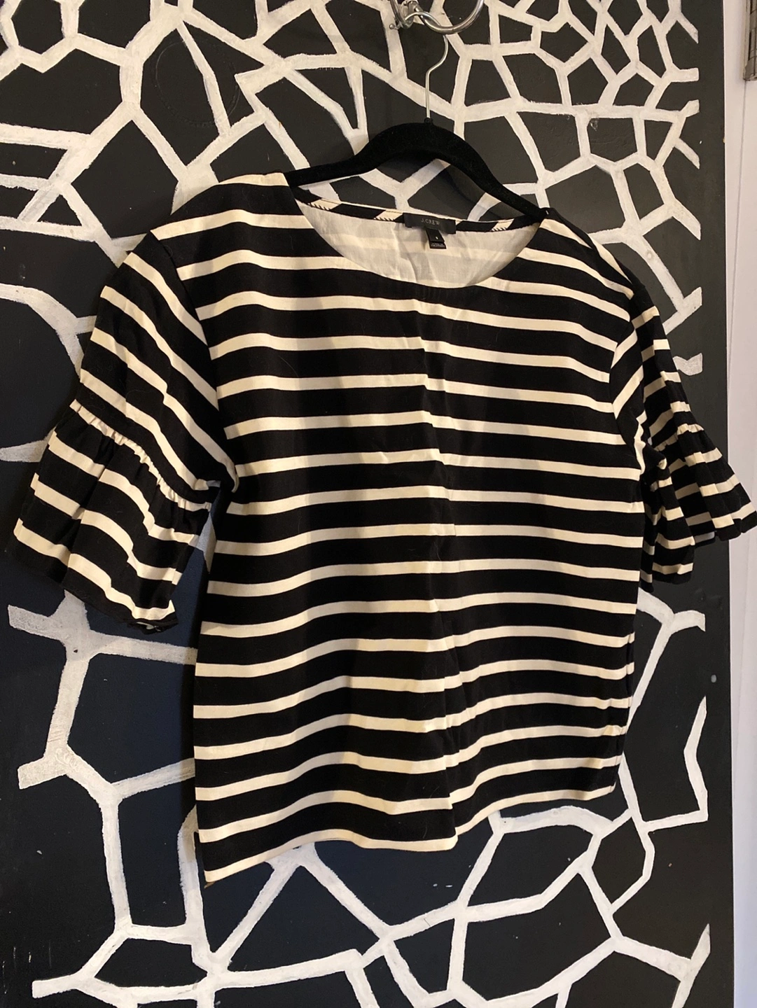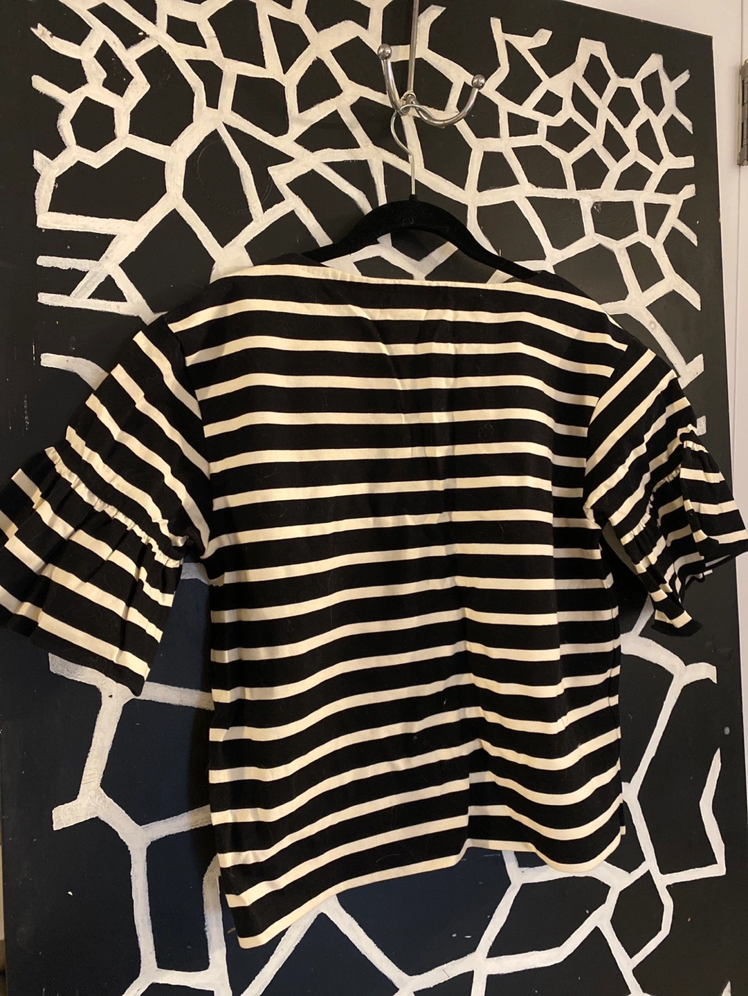 Black and white striped cotton blouse. Features ruffle sleeves and a relaxed fit. Size small, fits oversized.