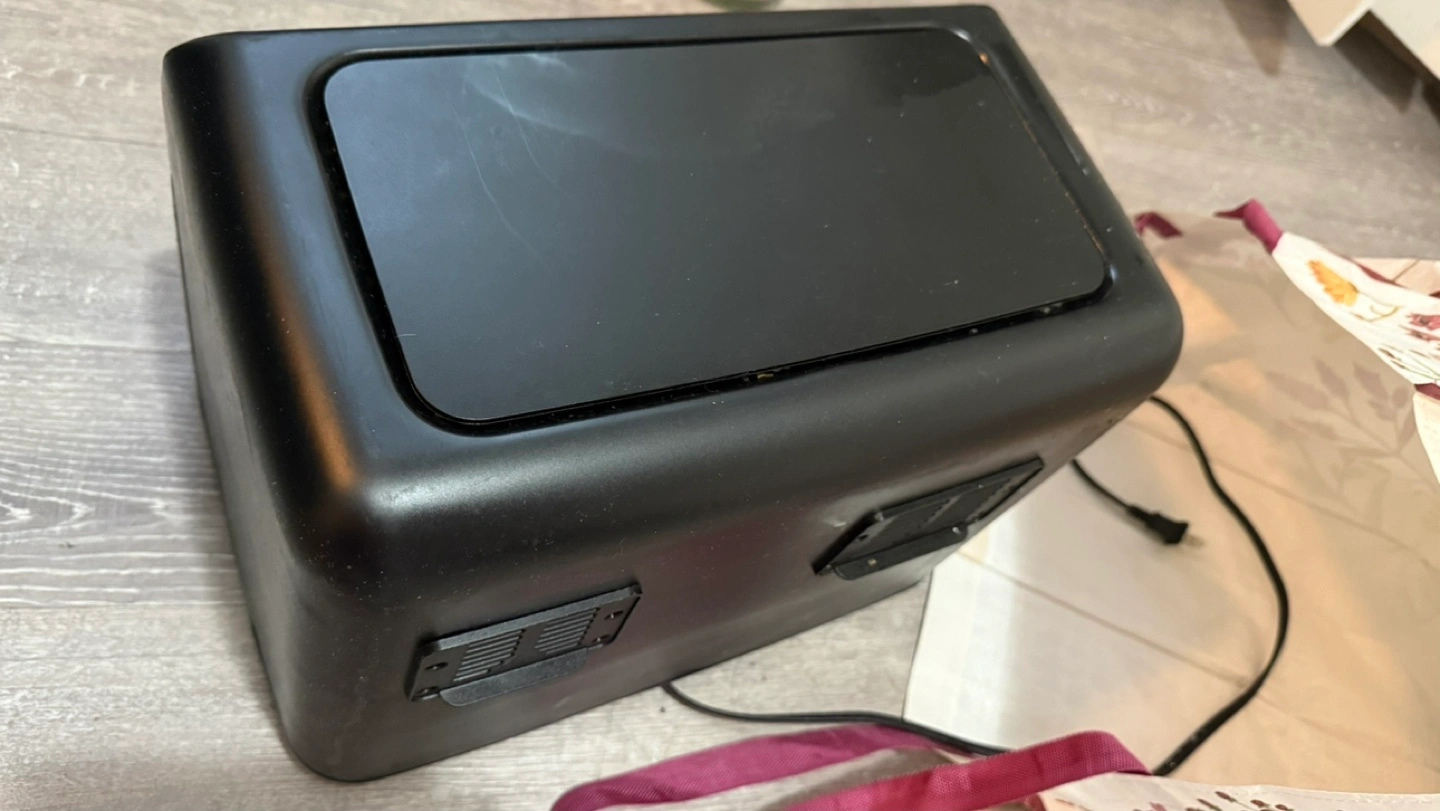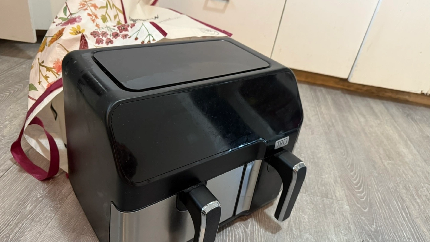 Black and stainless steel dual basket air fryer. Digital controls. Two baskets, 5.5 and 3.5 quart.