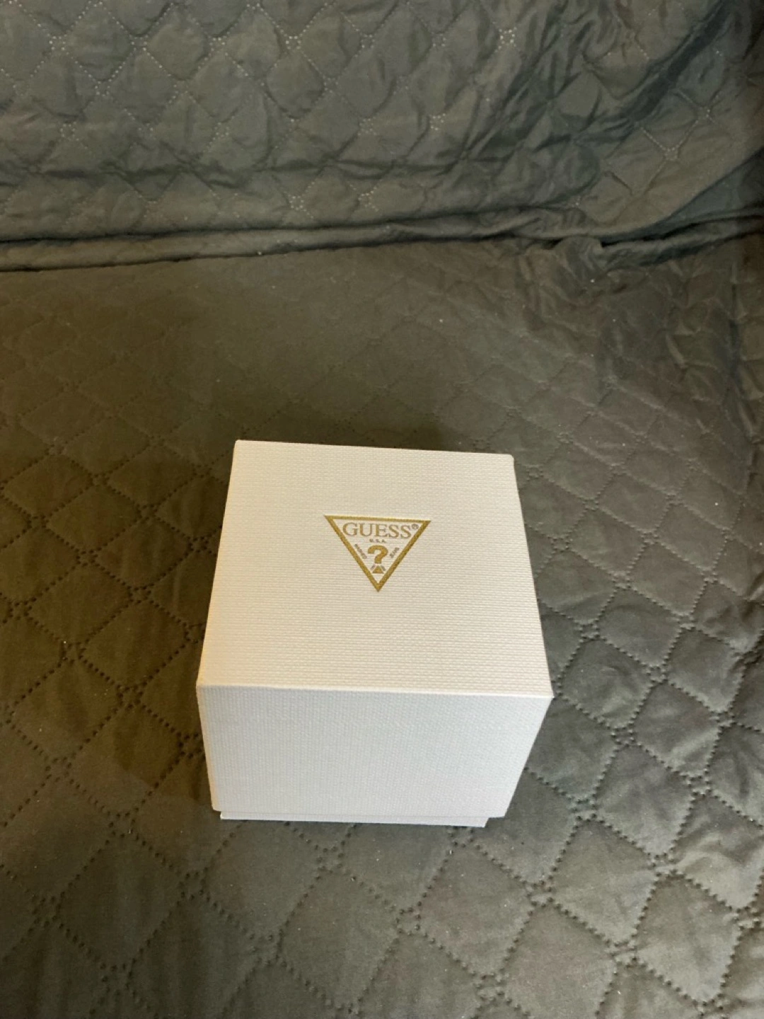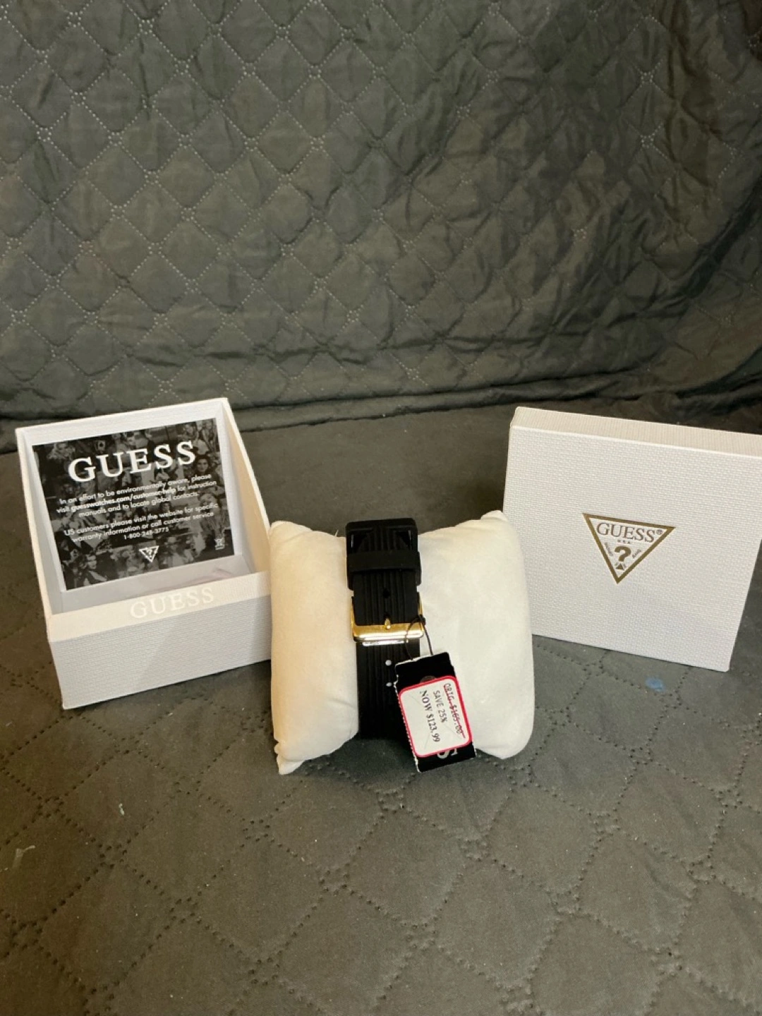 Brand new Guess men's watch. Gold-tone casing and black silicone band. Chronograph features. Comes in original box.