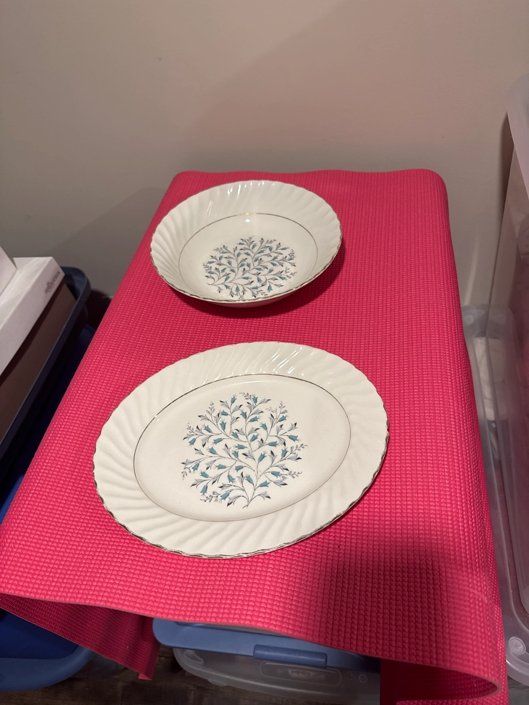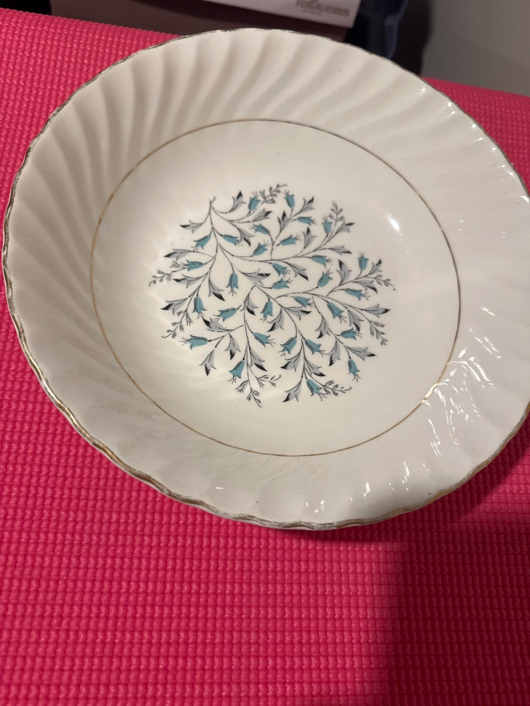 Set of vintage plate and bowl. Cream coloured with blue and grey floral design. Gold trim. Small platter has a chip on the underside. Accented with 22 KT gold. Price for both pieces
