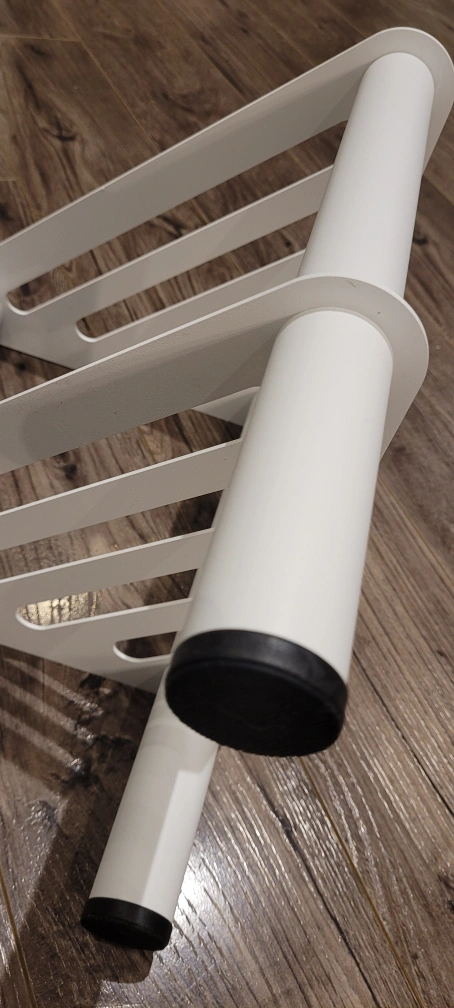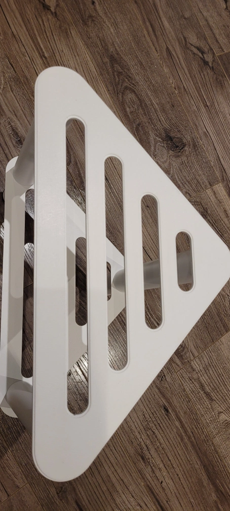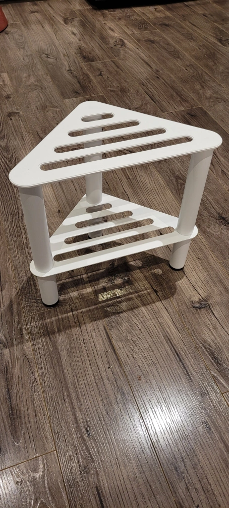 Two-tiered SOLID, STURDY, Metal Corner Shelf. White, Modern Design. Skid proof Shelf and Footing. Very Simple and Easy assembly. ("Dummy proof, takes 2 min.) Great for bathrooms or small spaces. Minimalist style.
