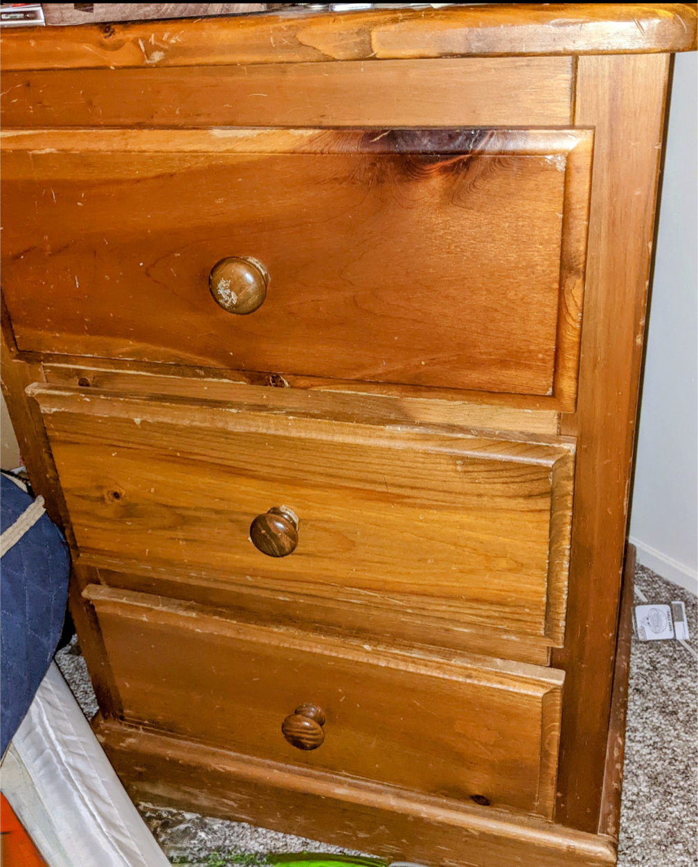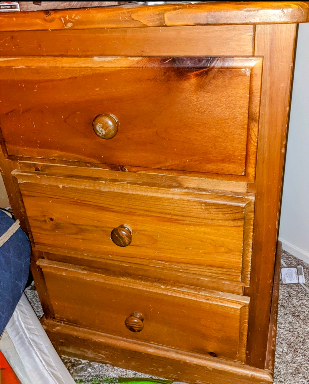 Three-drawer wooden nightstand. Solid wood construction. Scratches and wear consistent with age and use. Excellent storage solution.