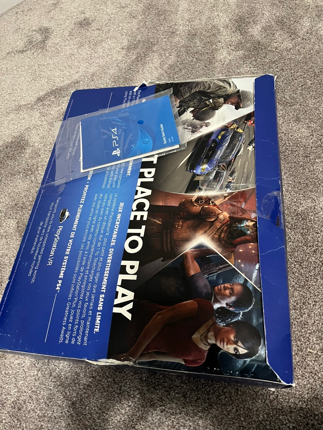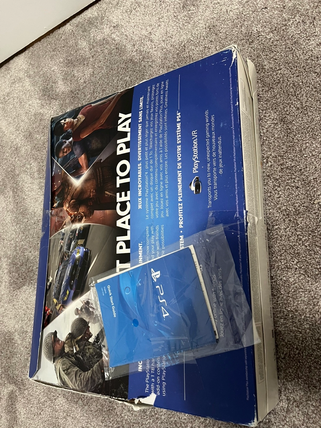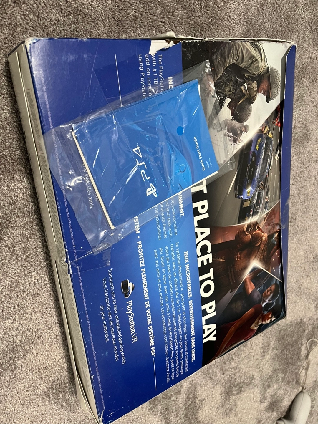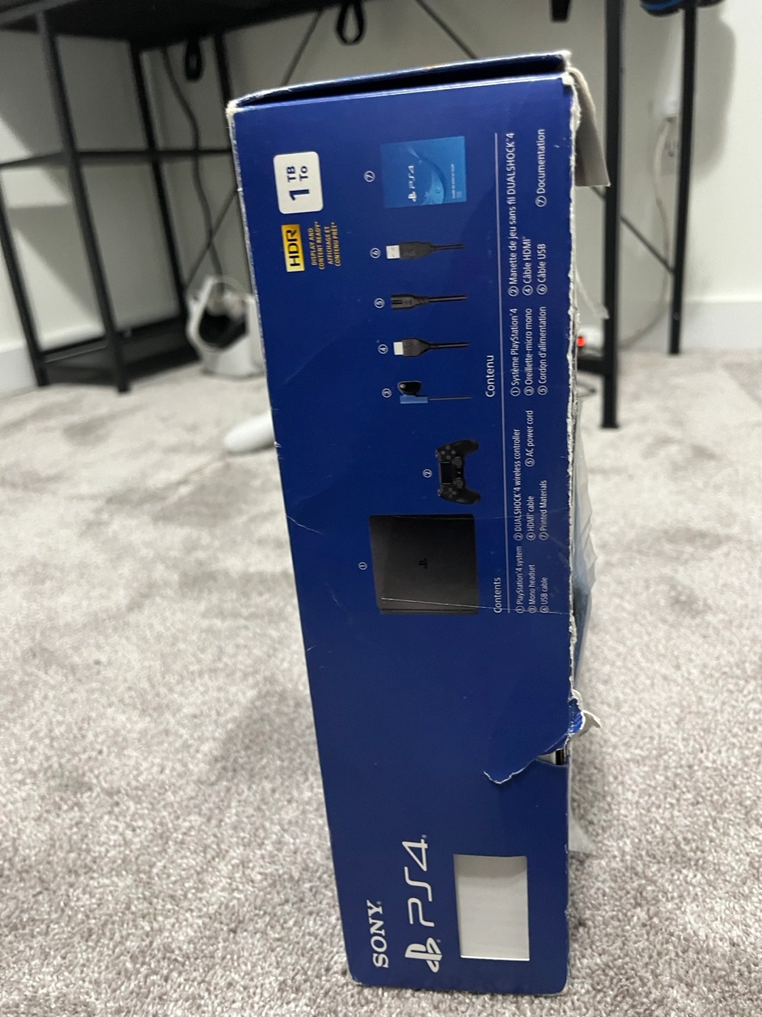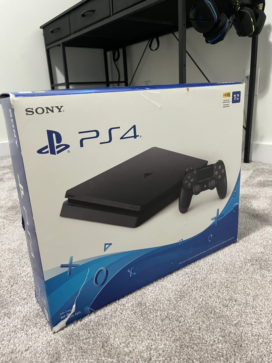 Pre-owned PlayStation 4 Slim console. 1TB hard drive. Includes controller and cables. Box shows wear. But missing charger