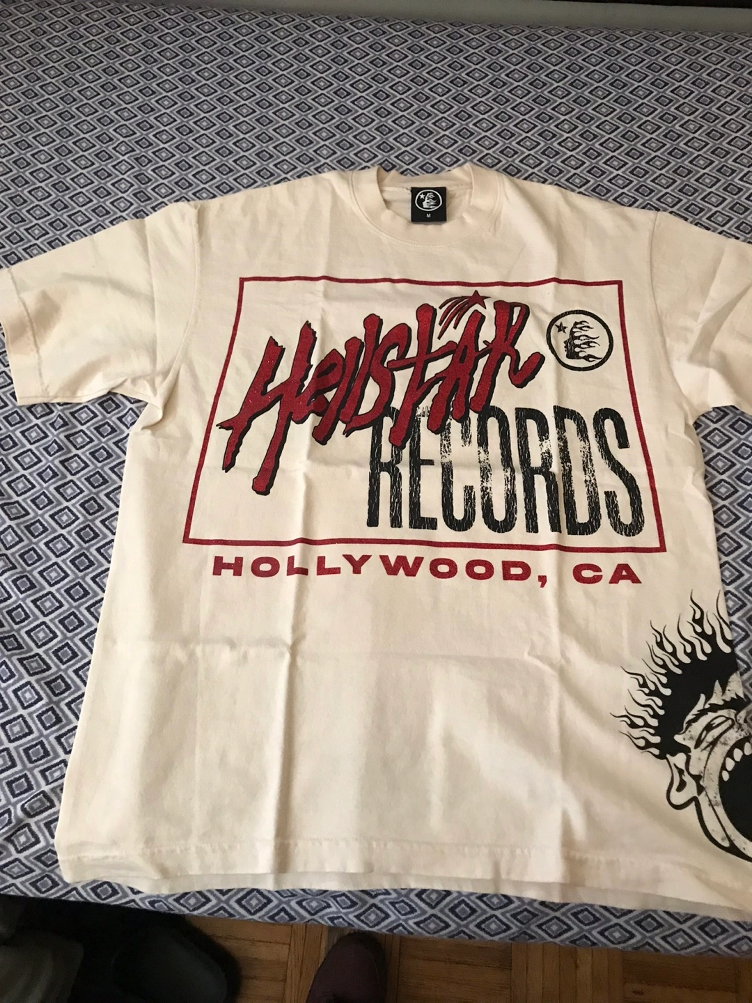 Cream colored short sleeve t-shirt. Front graphic features Hellstar Records logo and Hollywood, CA. Back graphic features additional Hellstar Records branding and artwork. Size Medium.