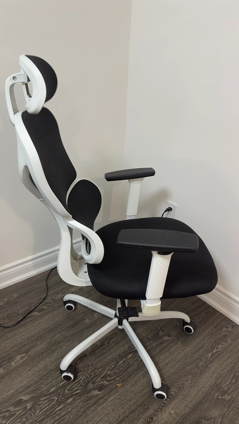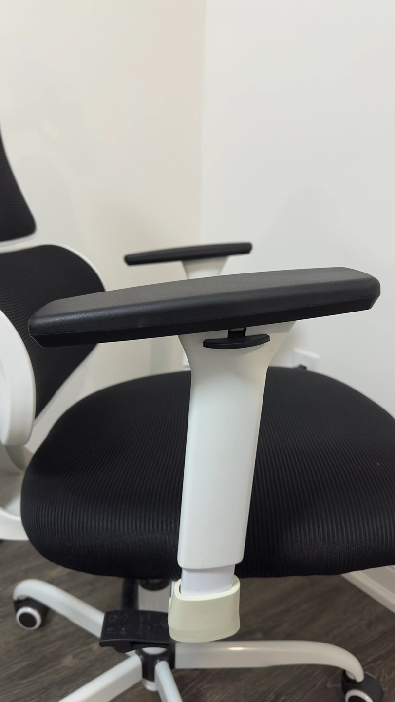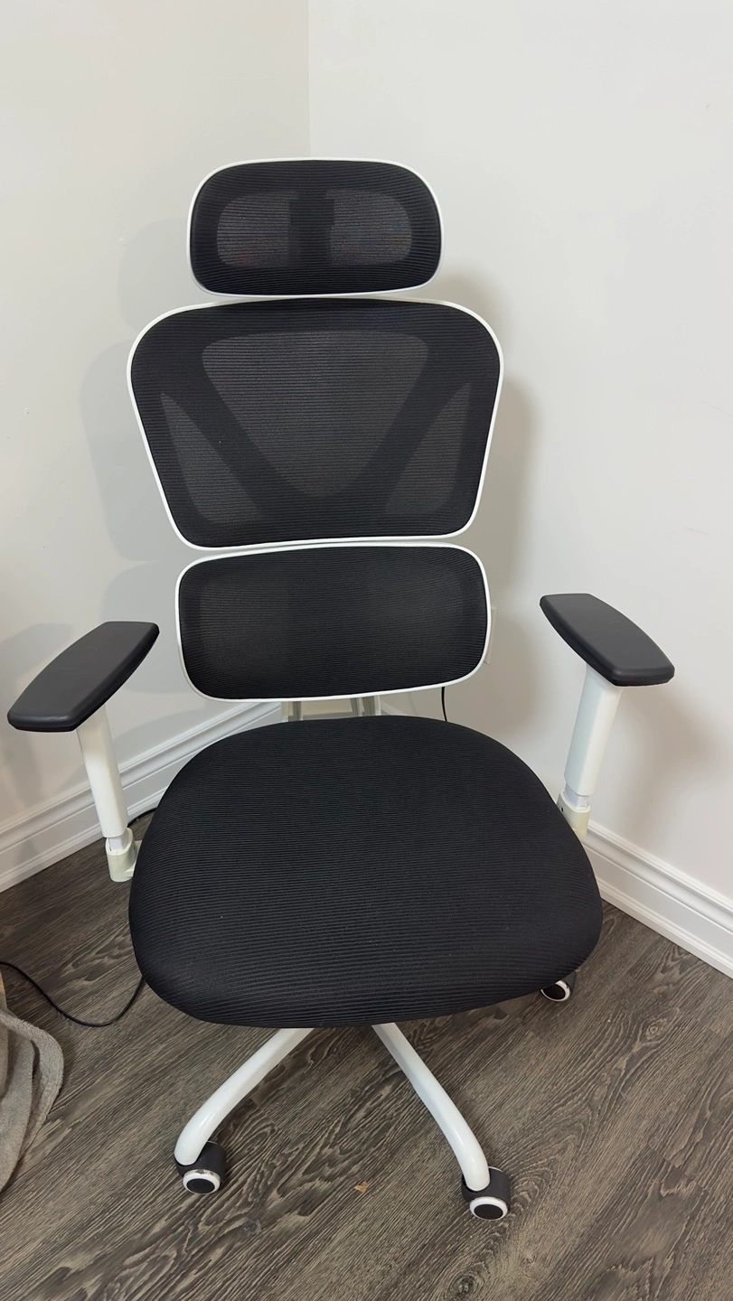 Comfortable mesh office chair. Features adjustable headrest and armrests. Black mesh back and seat. White frame. Five rolling casters. Great for home or office.