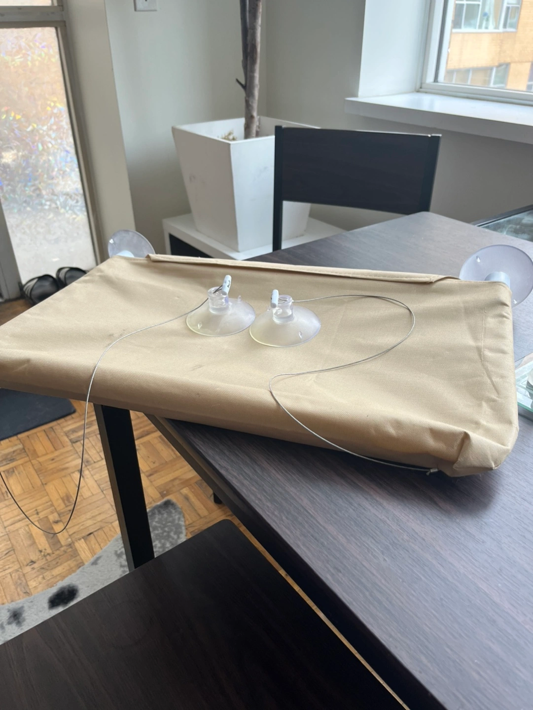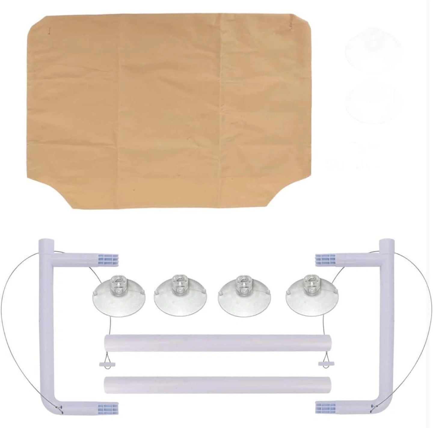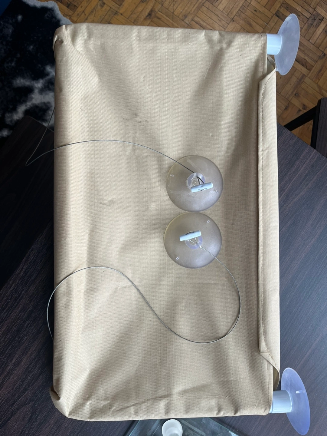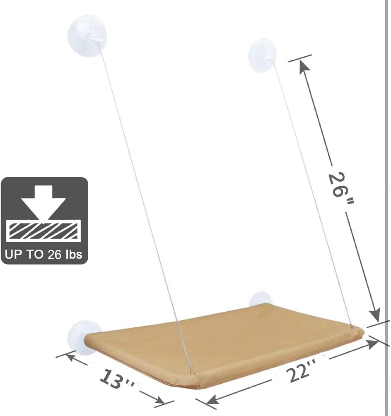 Neutral coloured cat bed, attaches to window via heavy duty suction cups. Holds up to 26 lbs. Assembled, but easy to take apart as shown.