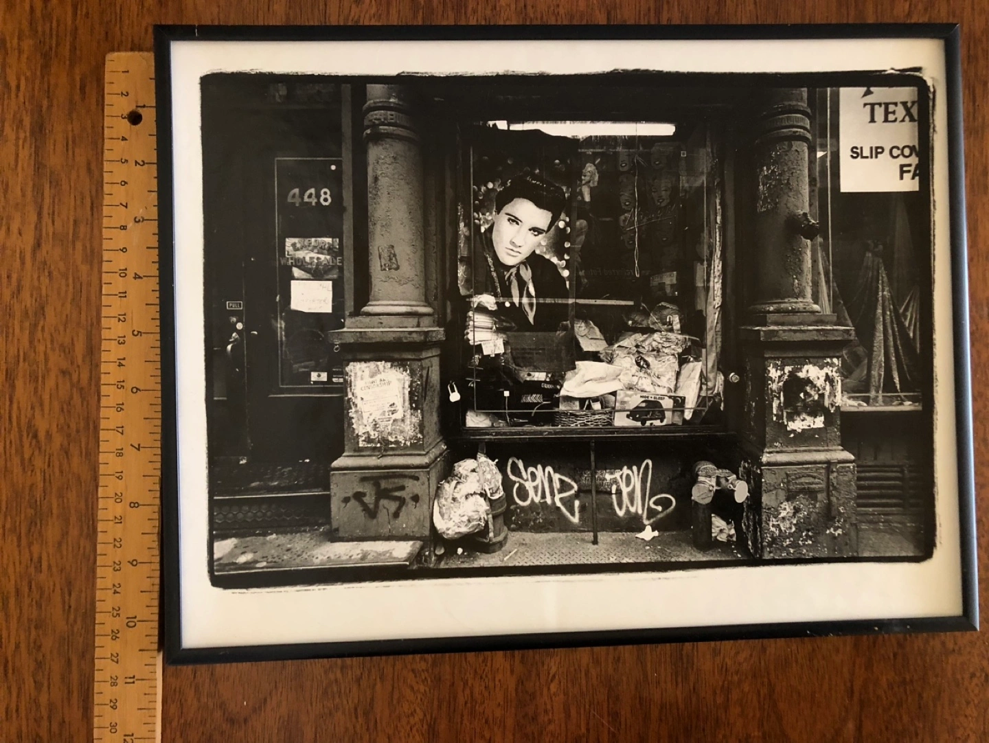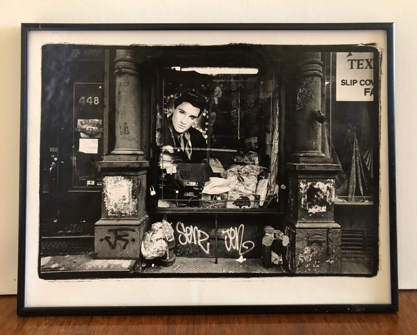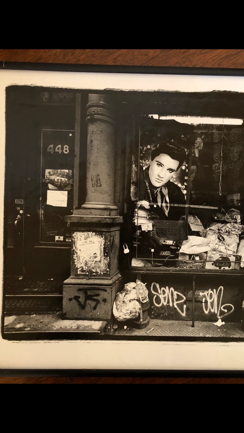 Black and white photo of Elvis Presley's image in a NYC shop window. Cool retro grunge feel. Framed print. No glass. Features building exterior and street scene. 14” x 10” Yonge/ Davisville pick up.