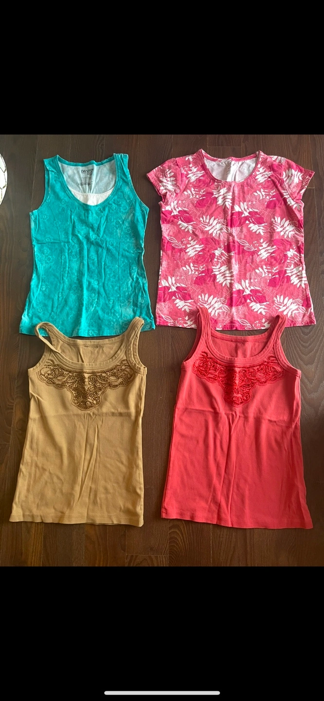 Bundle includes four women's tops. Two tank tops, one with teal floral print, the other beige with embroidery. Two short sleeve shirts, one coral with white floral print, the other pink with a white tropical print.