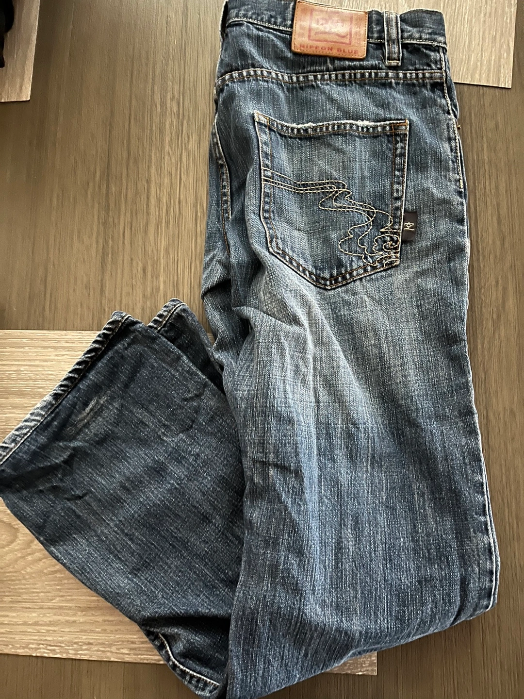 Men's Nippon Blue jeans. Size 33x32. Blue denim. Embroidered details on back pockets.