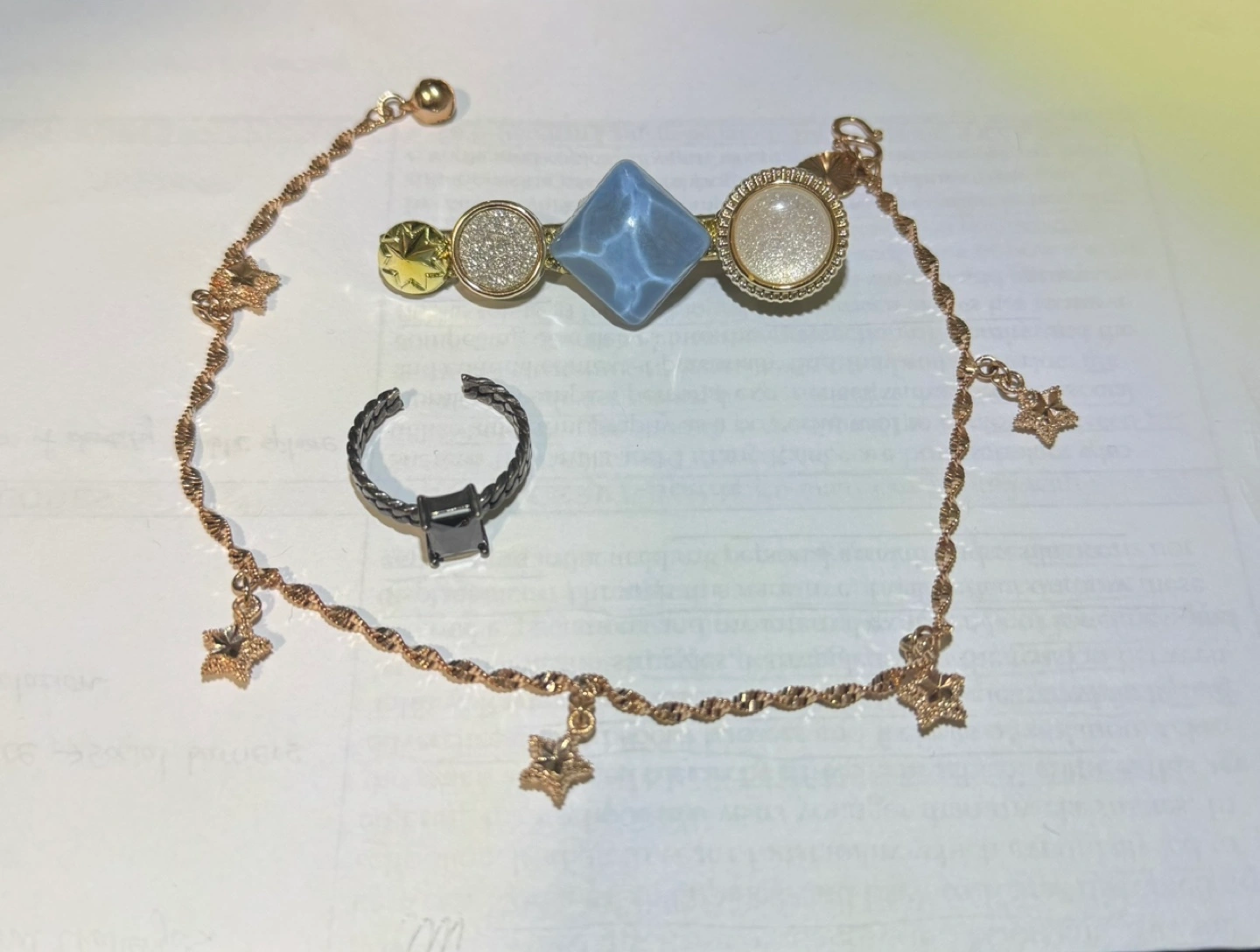 Beautiful gold anklet with star charms. Includes matching ring and hair clip. Perfect for adding a touch of elegance to your style.
