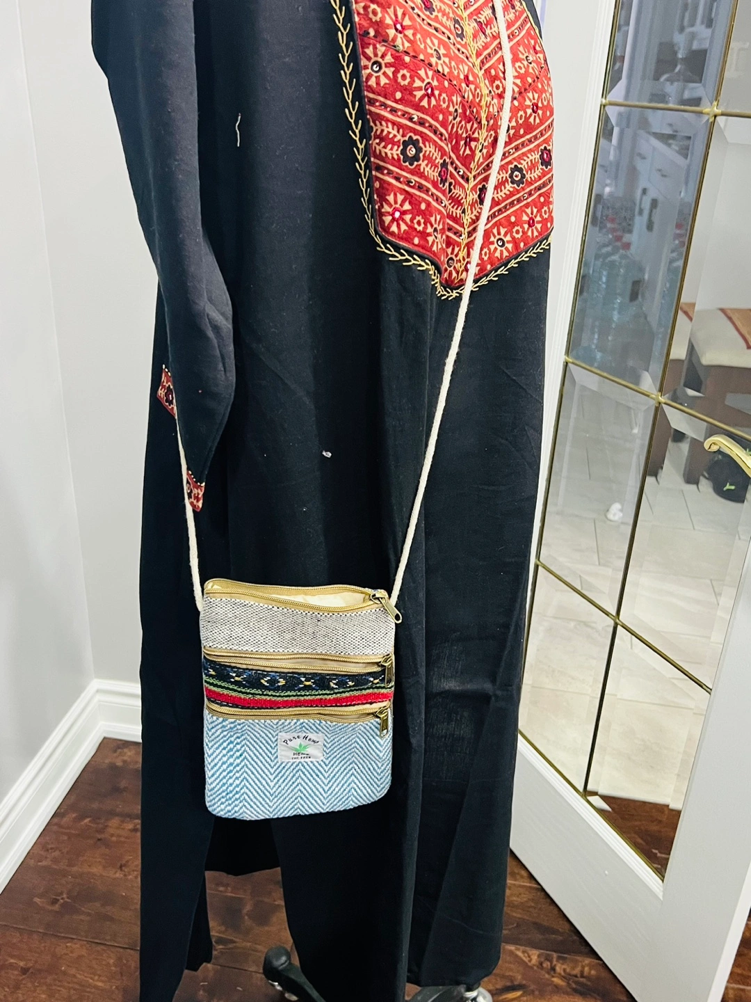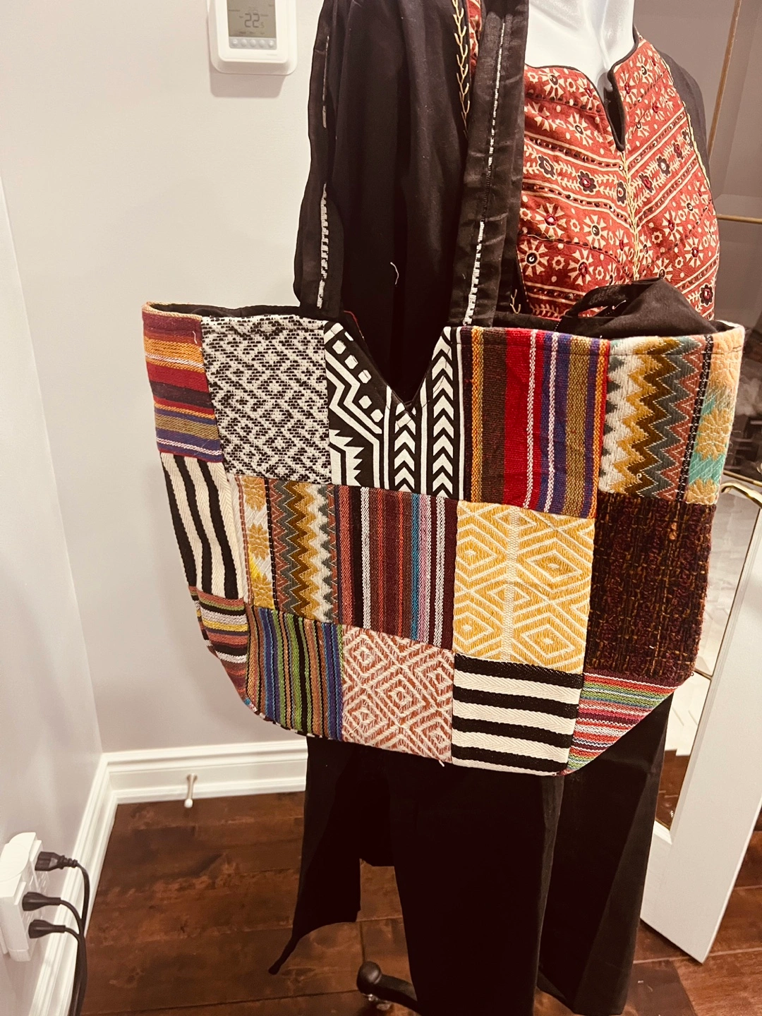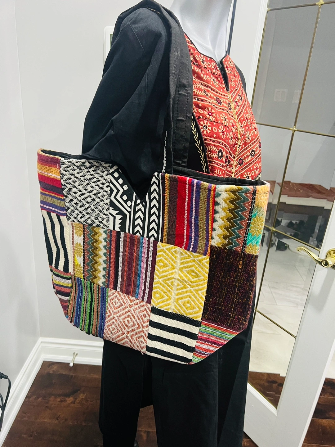 Set of four unique handbags. One large tote bag with colourful folk art print. Two smaller crossbody bags, one with chevron pattern, one with similar folk art print. One patchwork tote bag. Great for everyday use or travel.15$ to 30$