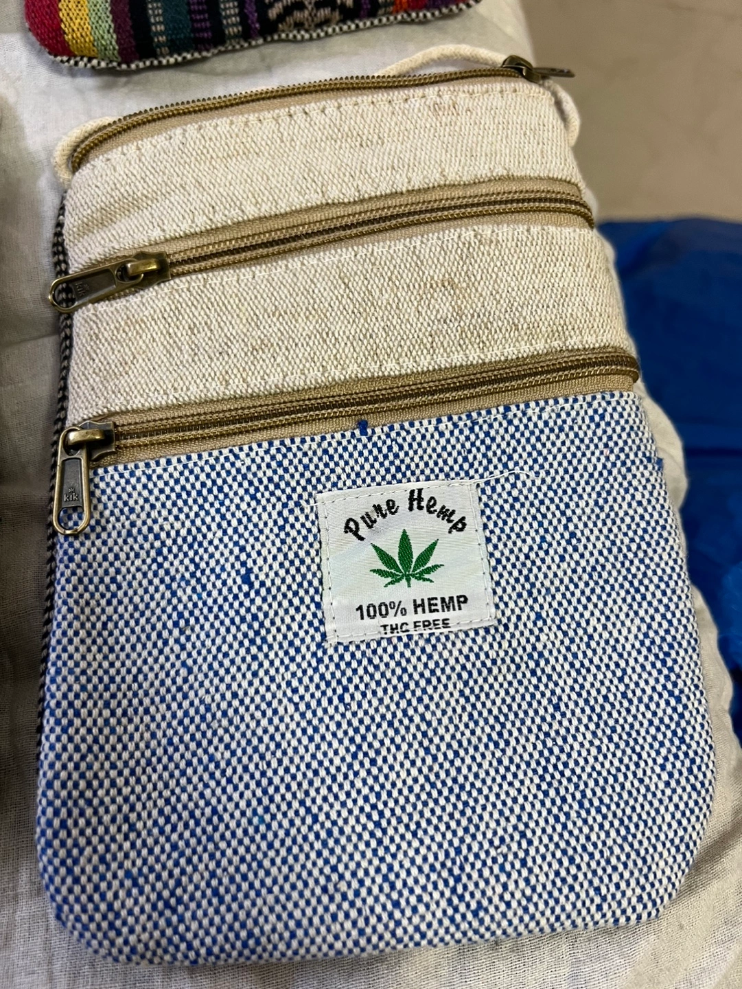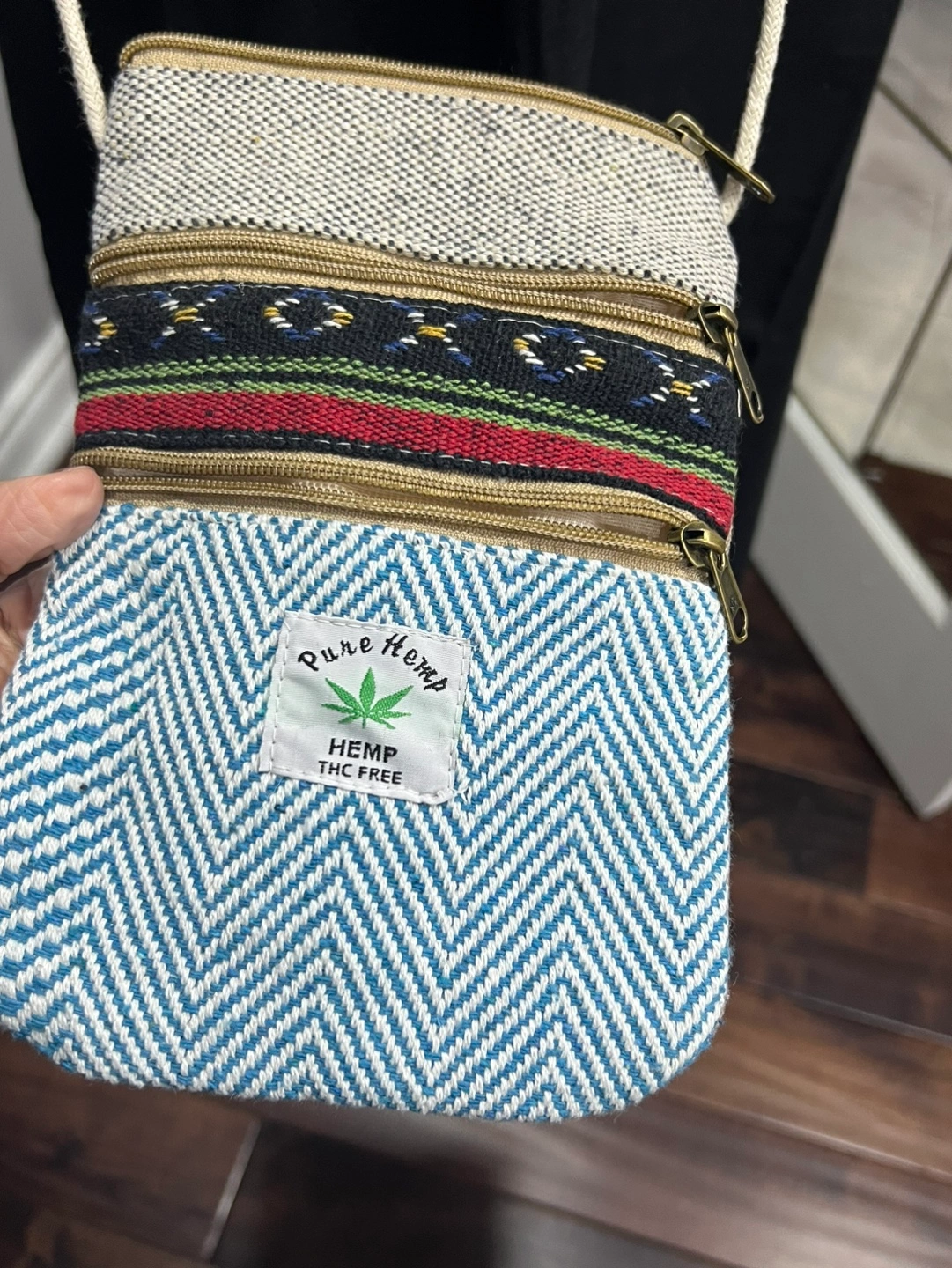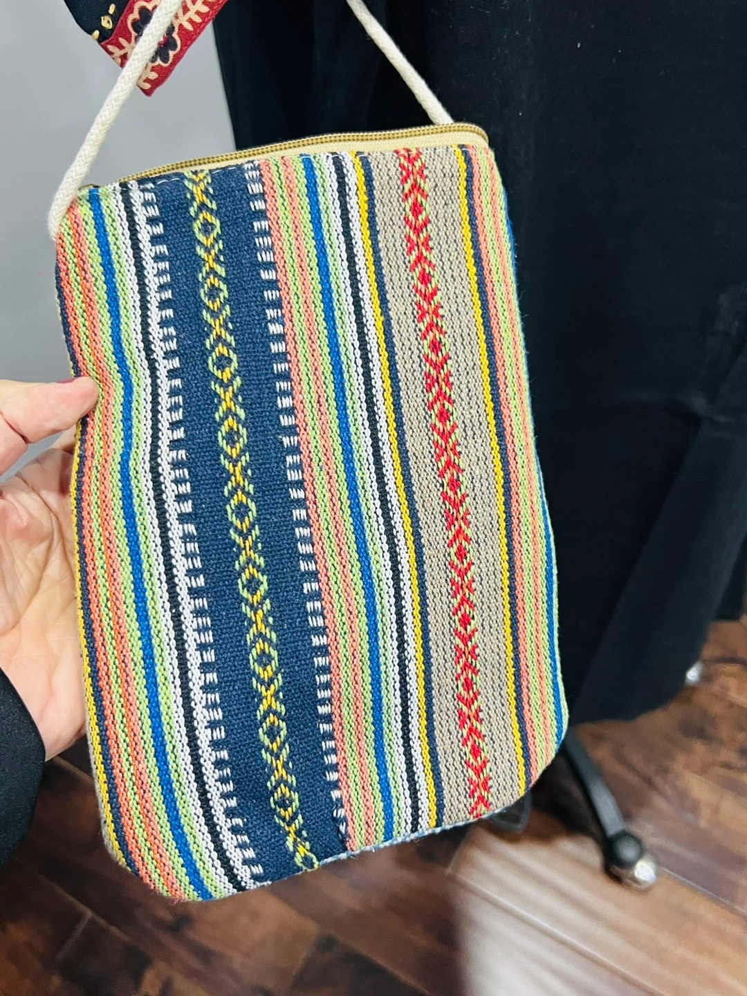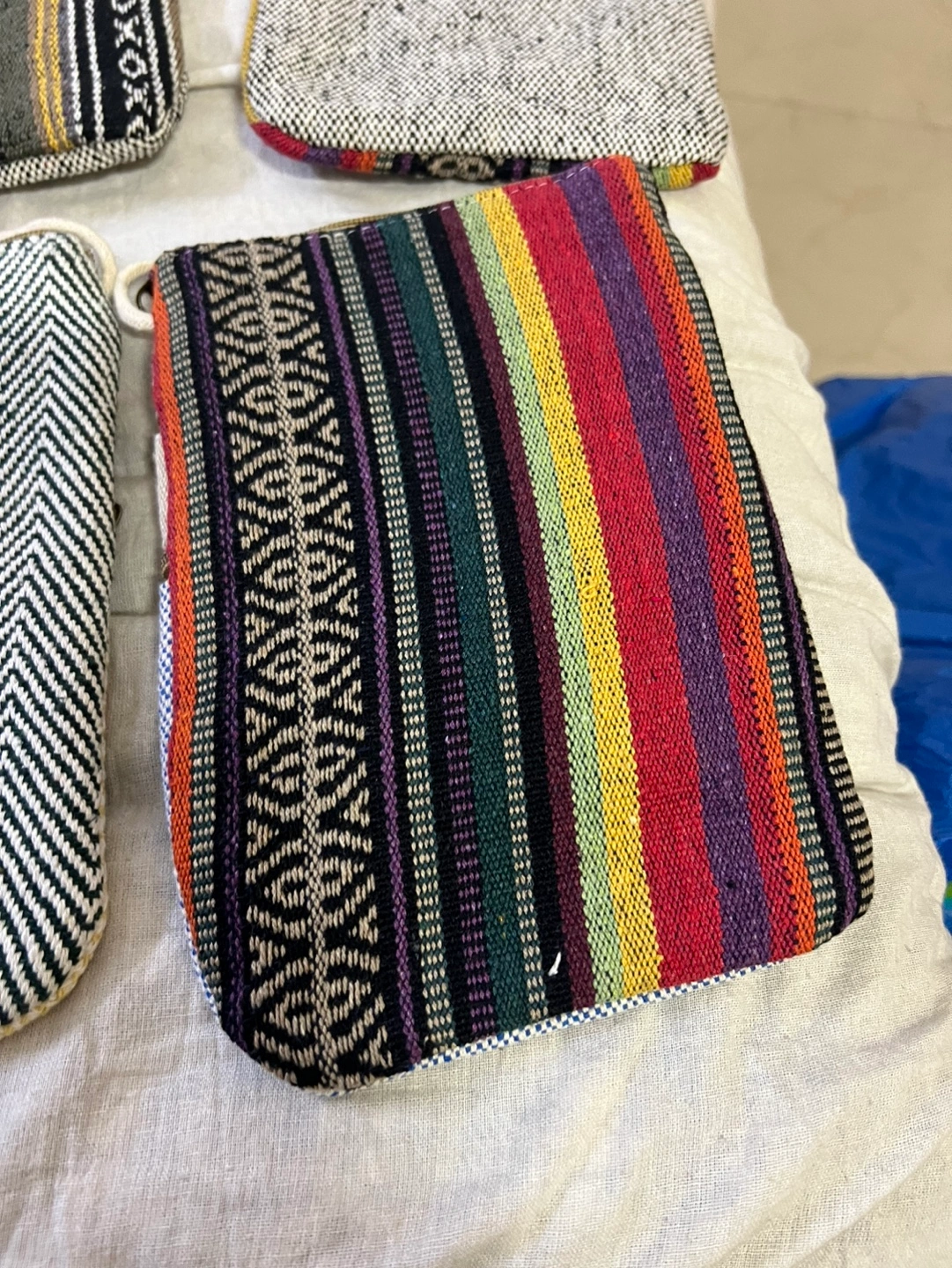 Set of four unique handbags. One large tote bag with colourful folk art print. Two smaller crossbody bags, one with chevron pattern, one with similar folk art print. One patchwork tote bag. Great for everyday use or travel.15$ to 30$