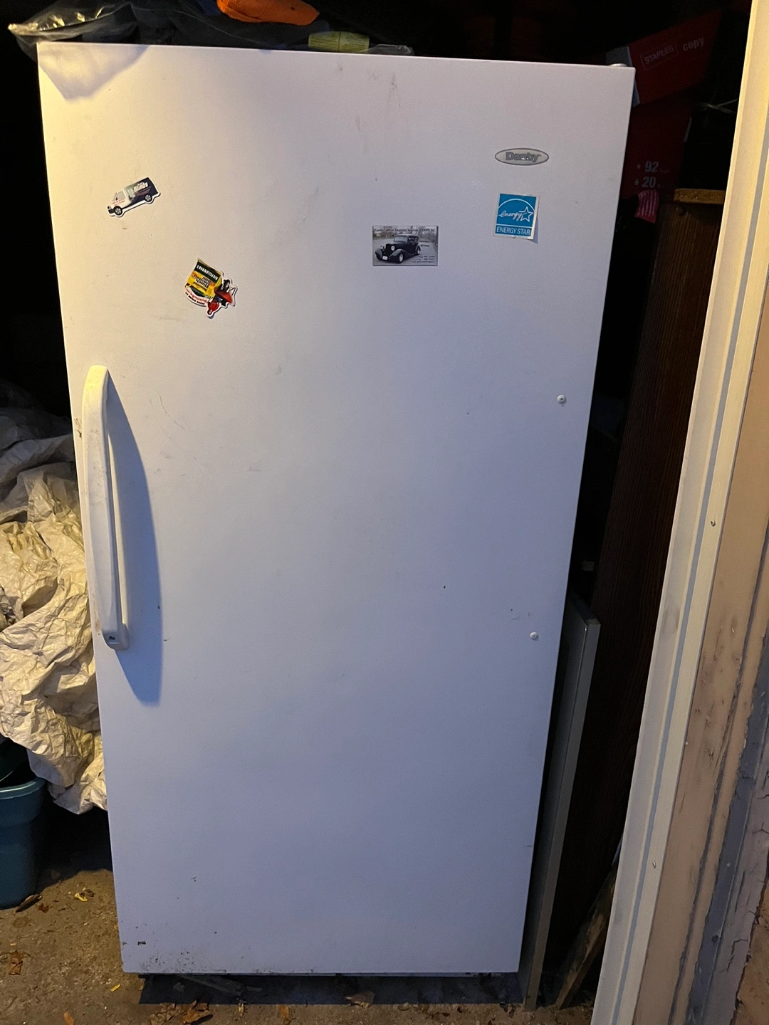 White upright fridge. No freezer. Energy Star rated. Shows some wear. Needs some cleaning inside.