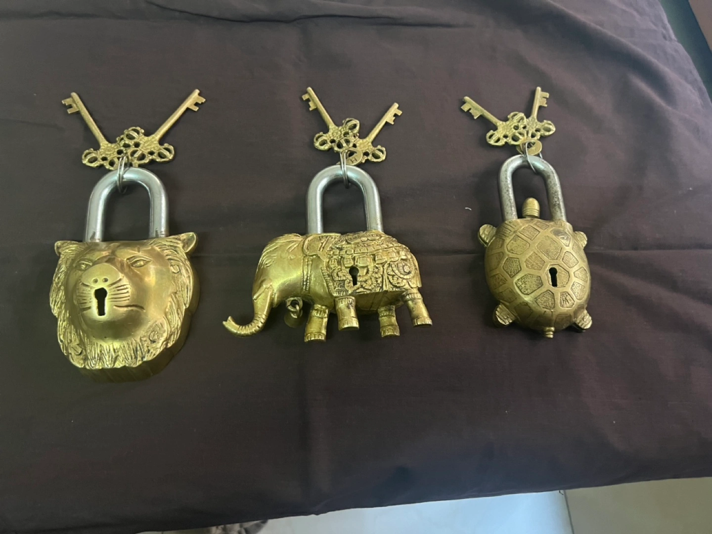 Set of three brass padlocks. Each padlock features a different animal; a lion, an elephant, and a turtle. Each comes with two keys. Unique and decorative.25$ each only lion available now