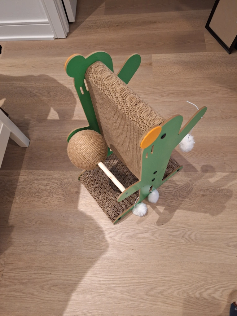Adorable cardboard scratching post. Features a fun design, multiple textures for scratching, and dangling toys. Perfect for kittens and cats.