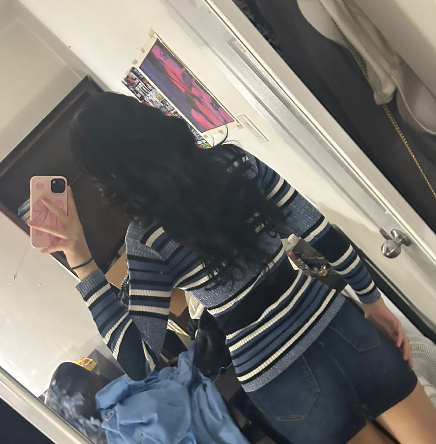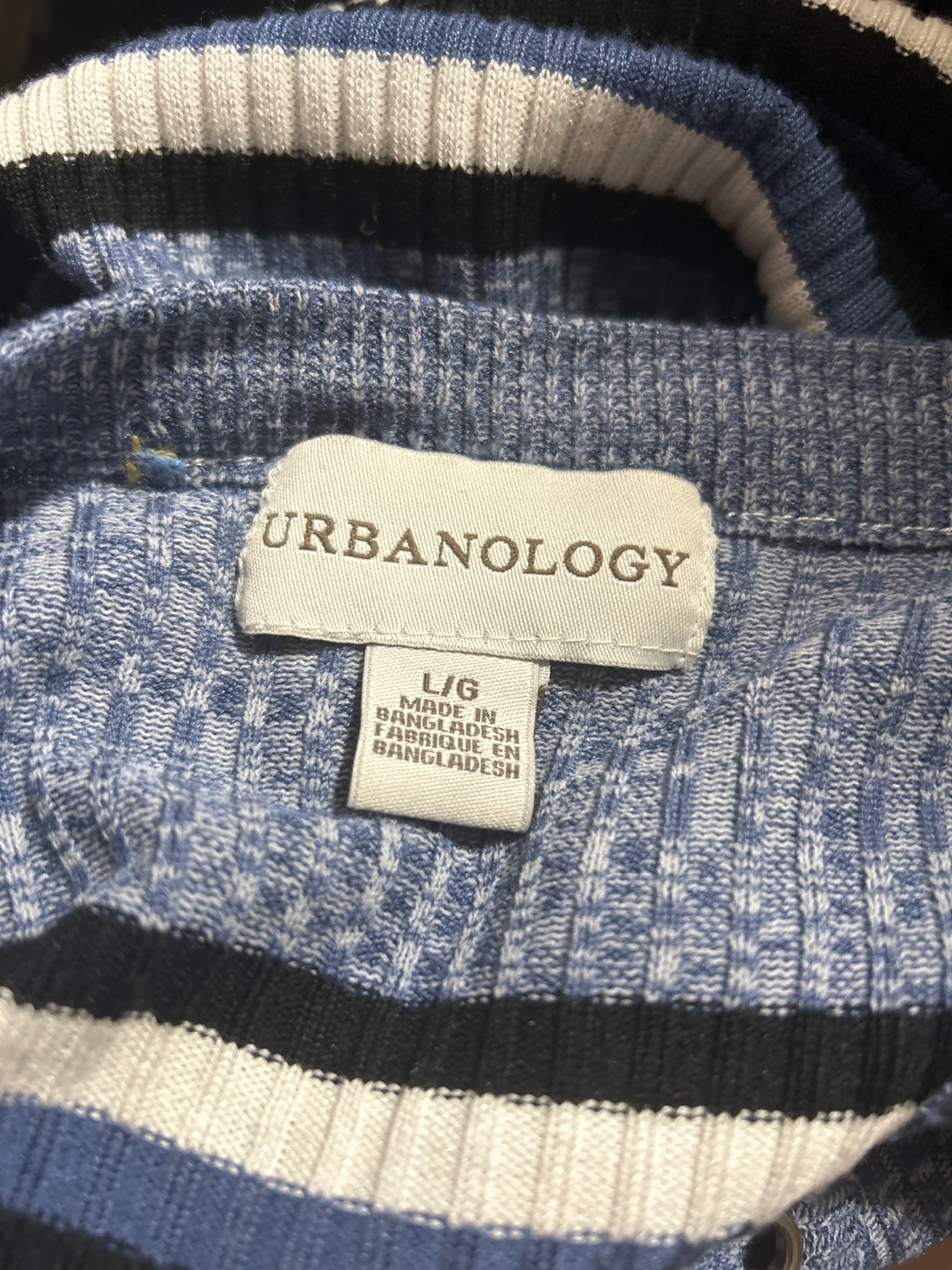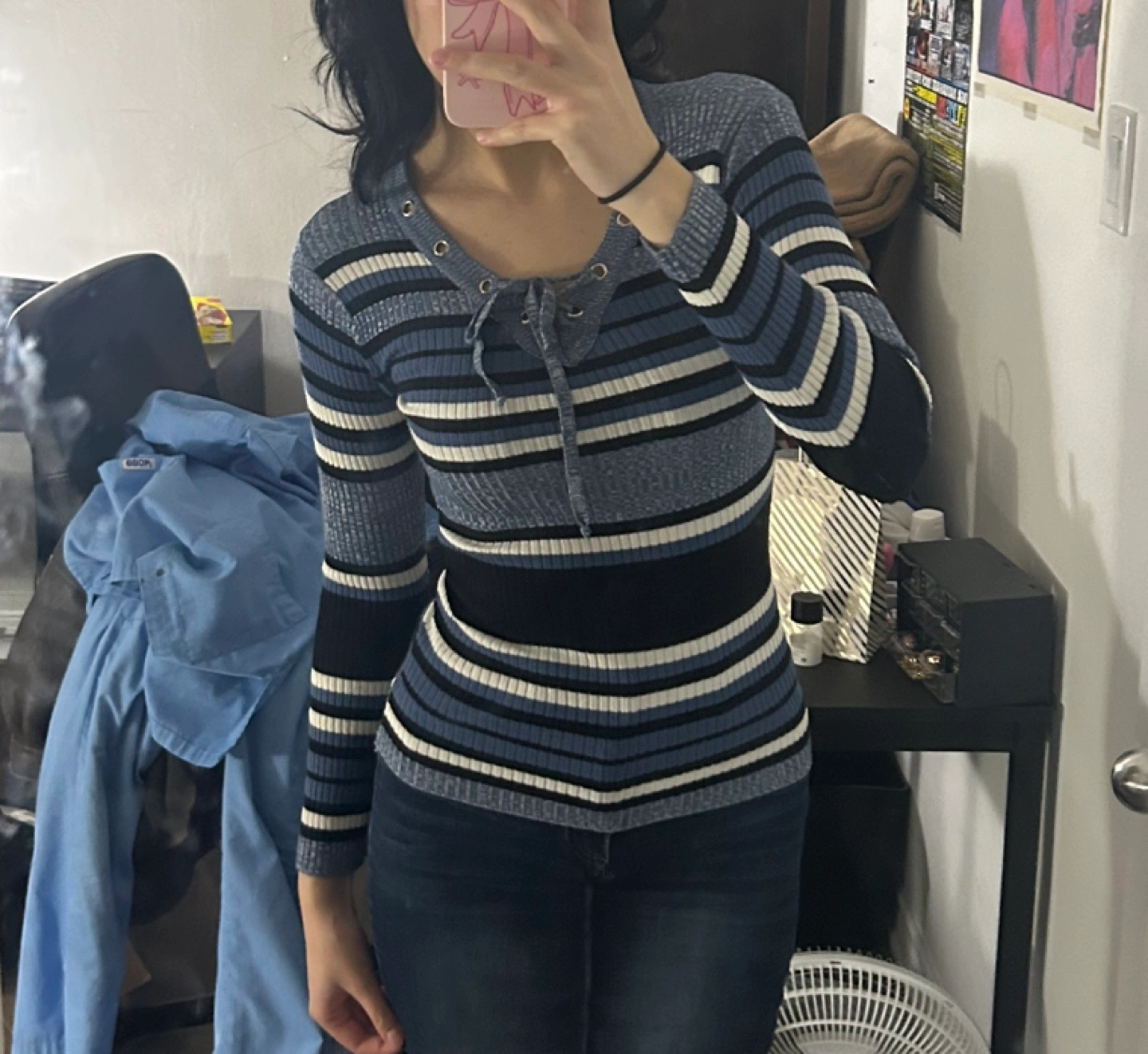 Long-sleeved sweater. Blue, black, and white horizontal stripes. Lace-up detail at neckline. Size large. Very stretchy.