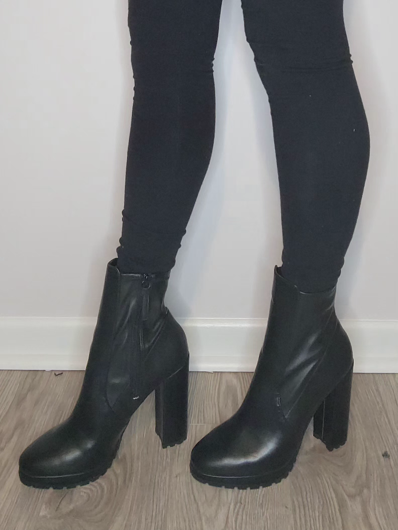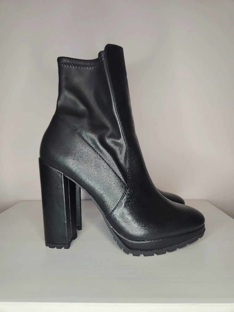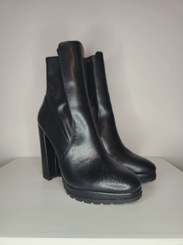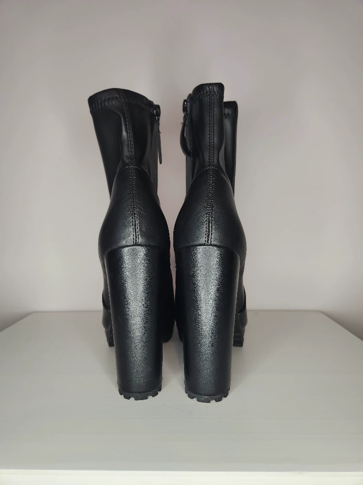 Black leather-look ankle boots. Block heel. Side zip. Platform sole. Excellent condition.