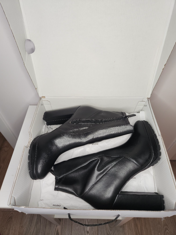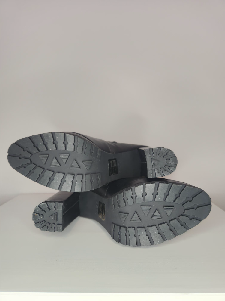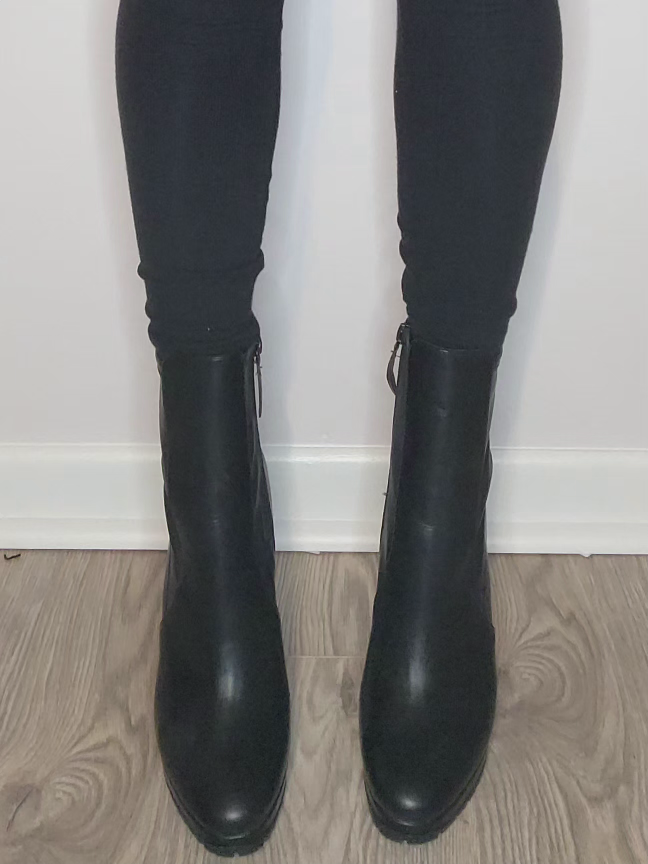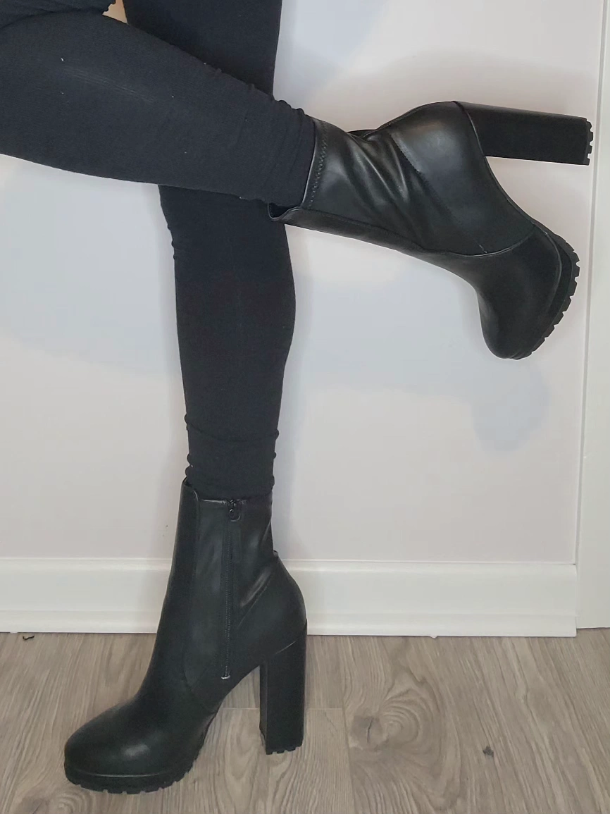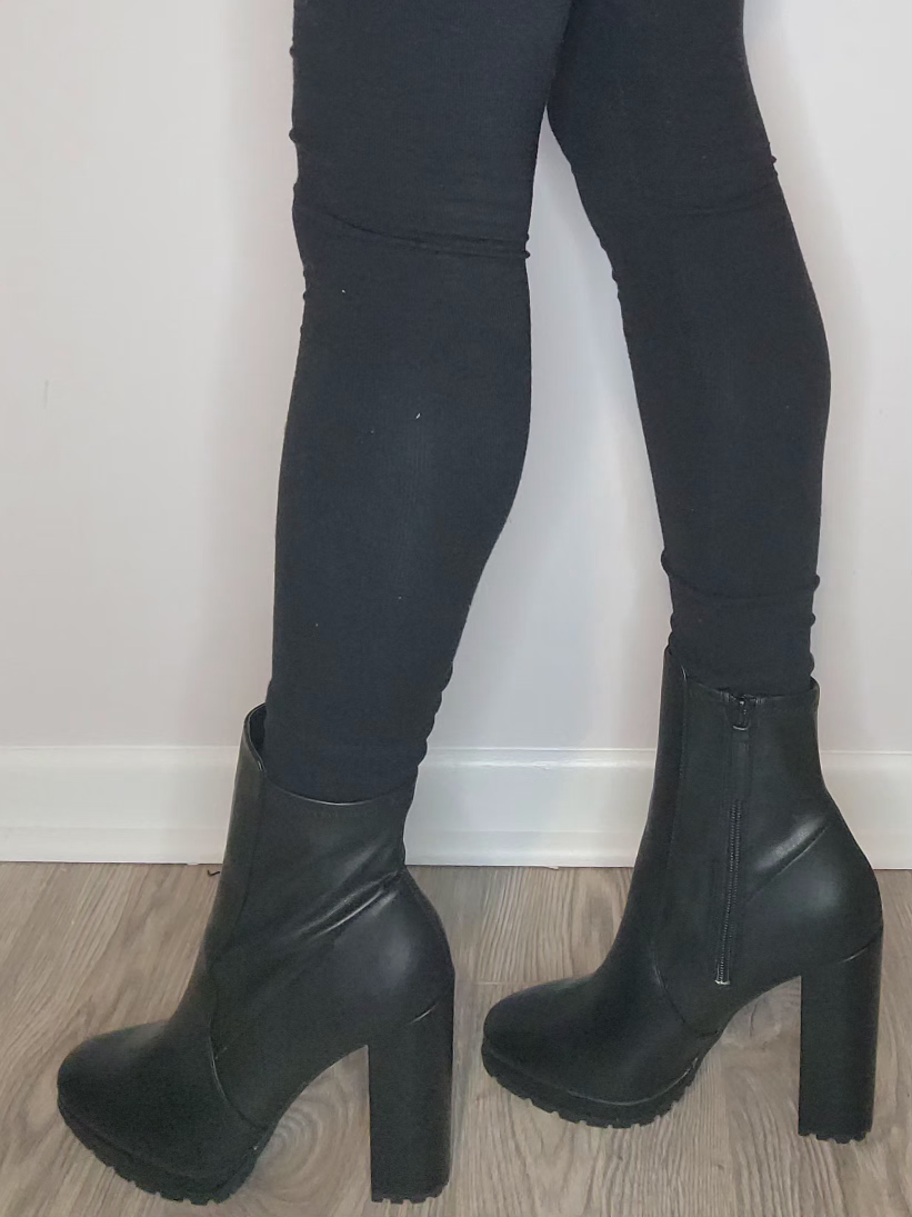 Black leather-look ankle boots. Block heel. Side zip. Platform sole. Excellent condition.