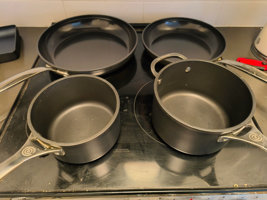 Features two high-end Green pans (10 and 12 inch) and two Le Creuset non-stick saucepans. Non stick on Green pans still work.
