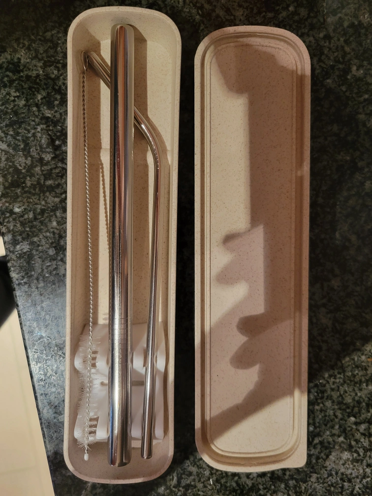 Reusable stainless steel straws, cleaning brushes, and a carrying case. Perfect for eco-conscious individuals.