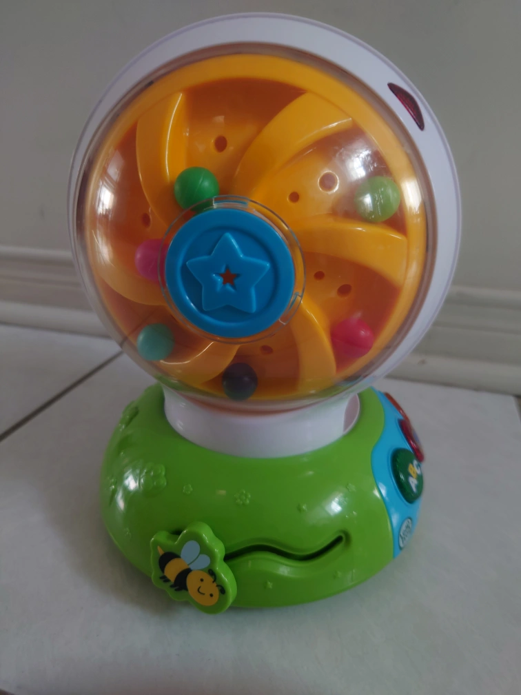 Educational toy for toddlers. Features spinning ball with letters, animals, and colourful balls inside. Interactive buttons and lights. Great for learning the alphabet and colours.