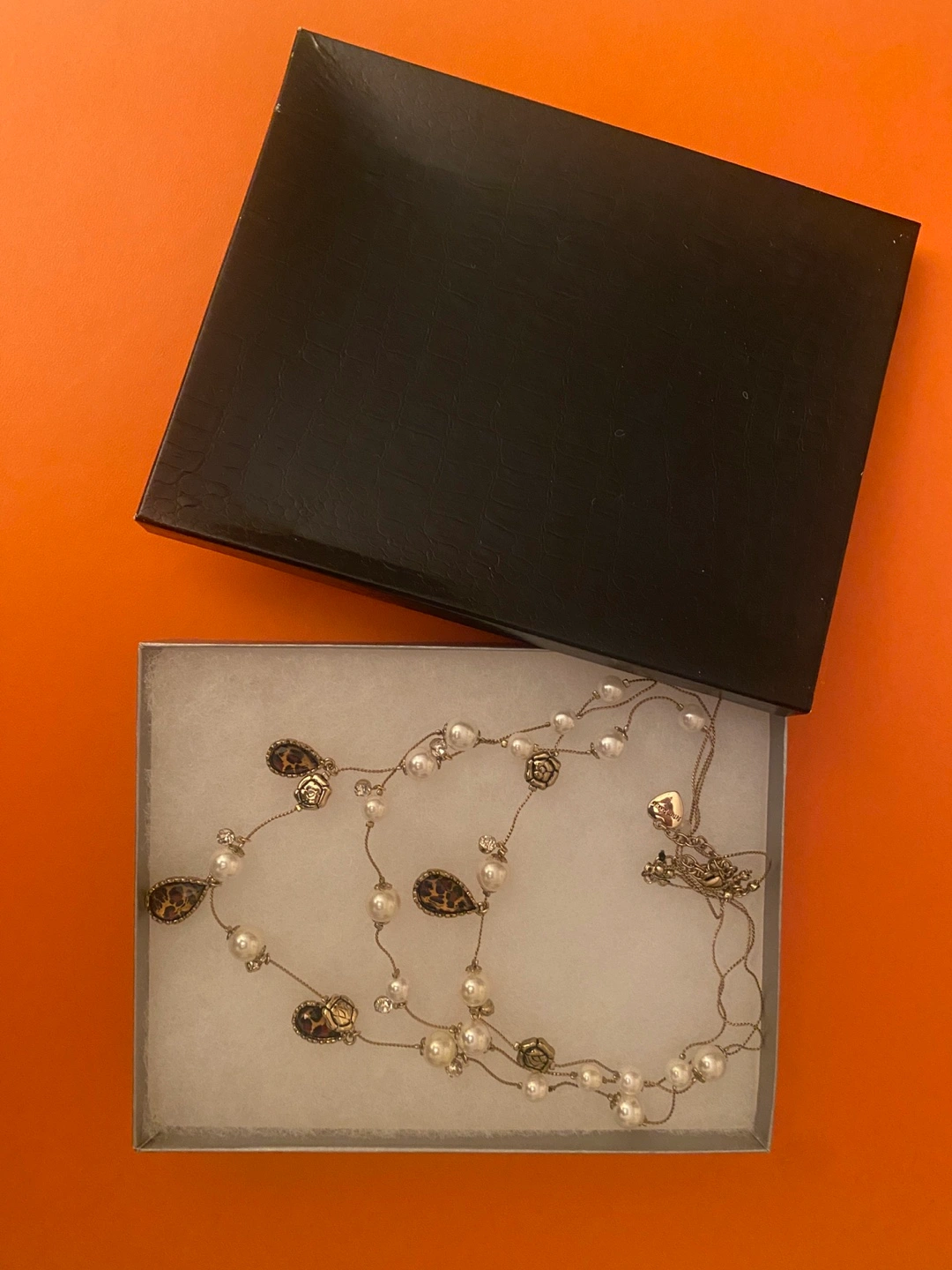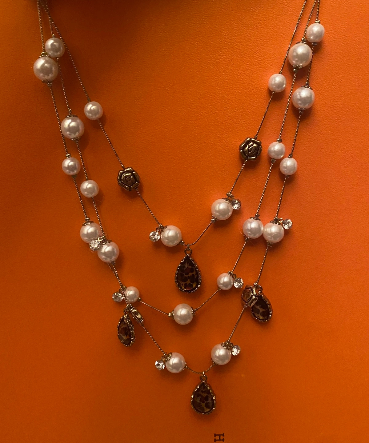 Elegant layered necklace. Features faux pearls, gold-tone metal accents, small rose and leopard print charms. Three strands of varying lengths. Beautiful statement piece.