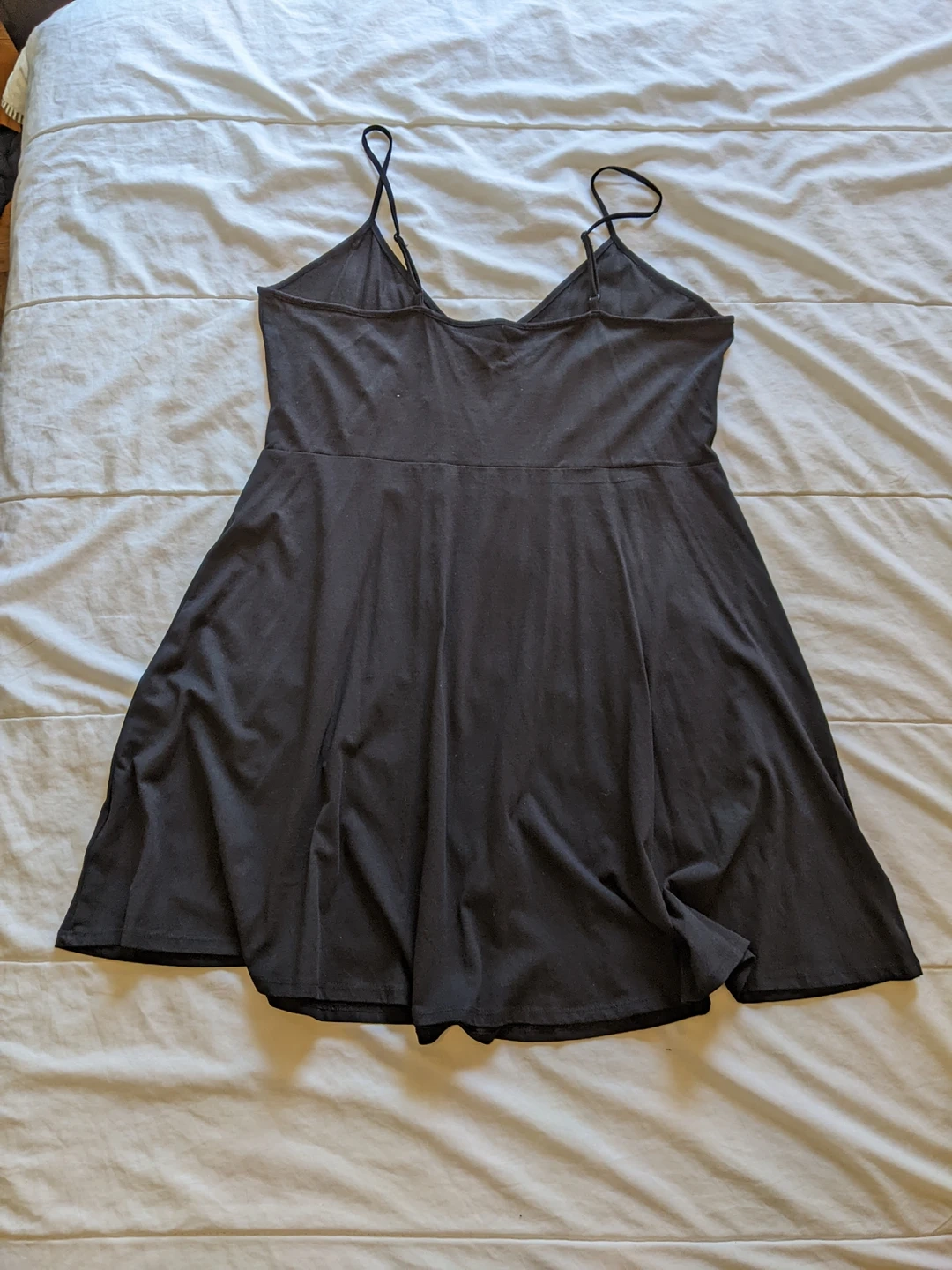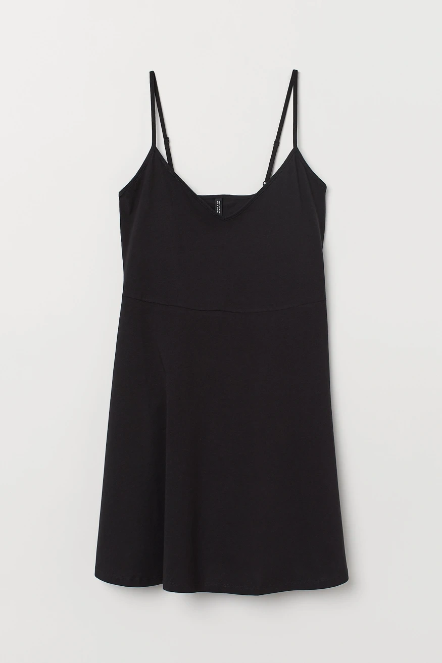 short, V-neck dress in soft jersey. Narrow, adjustable shoulder straps, seam at waist, and flared skirt