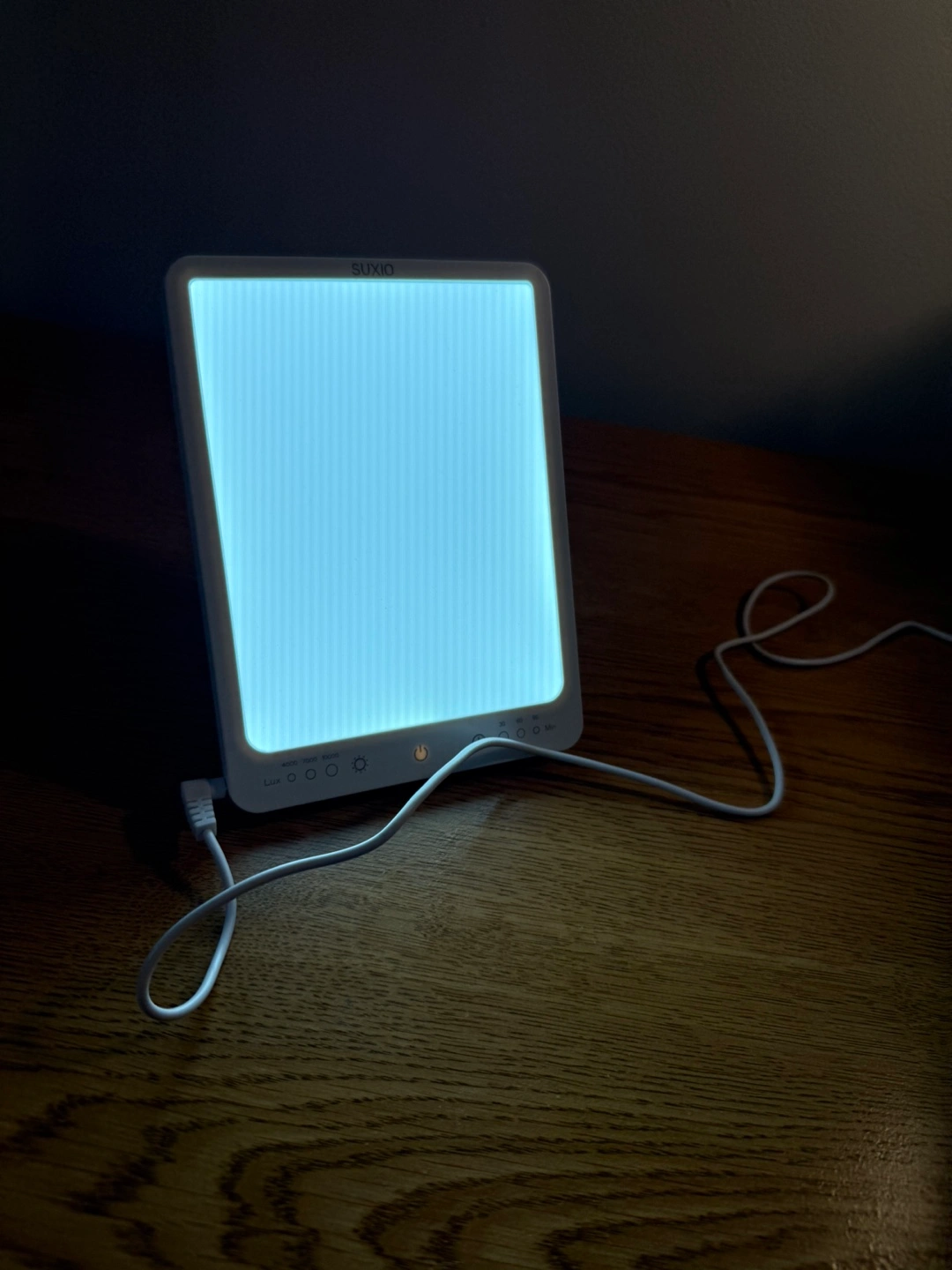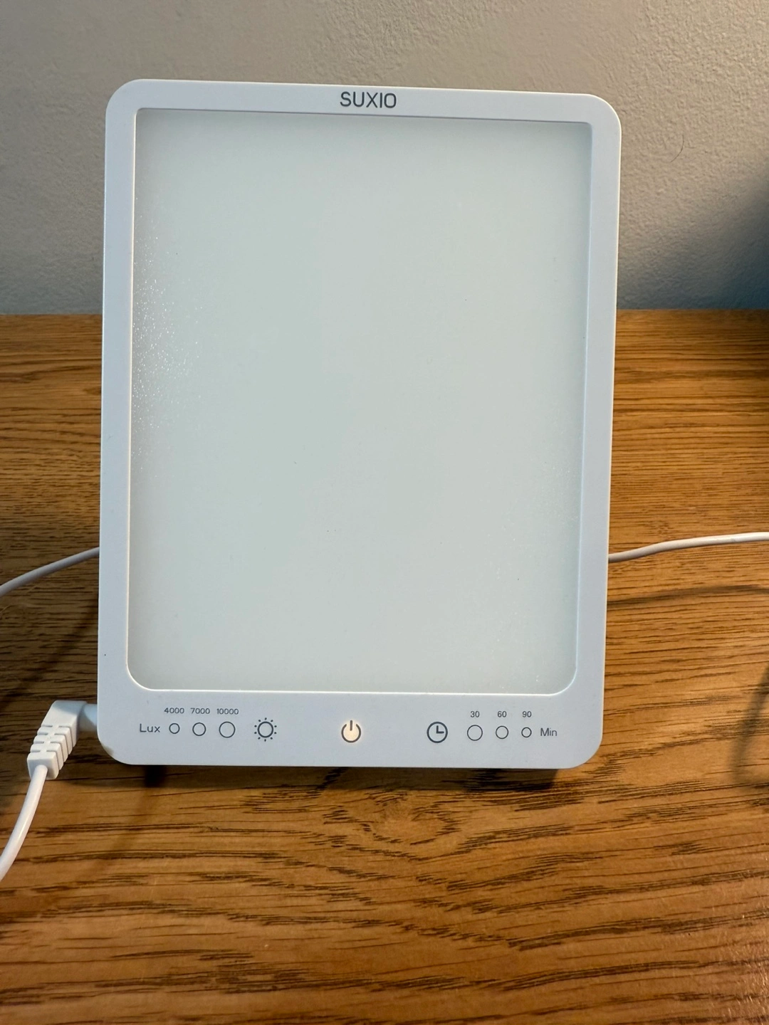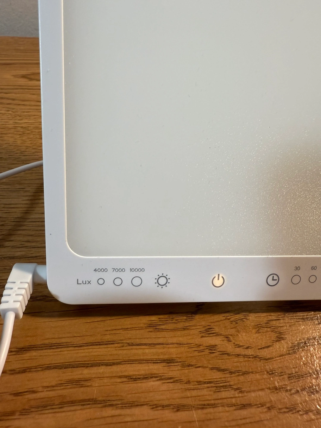 White light therapy lamp. Adjustable brightness and timer settings. Includes power cord. Excellent for SAD.