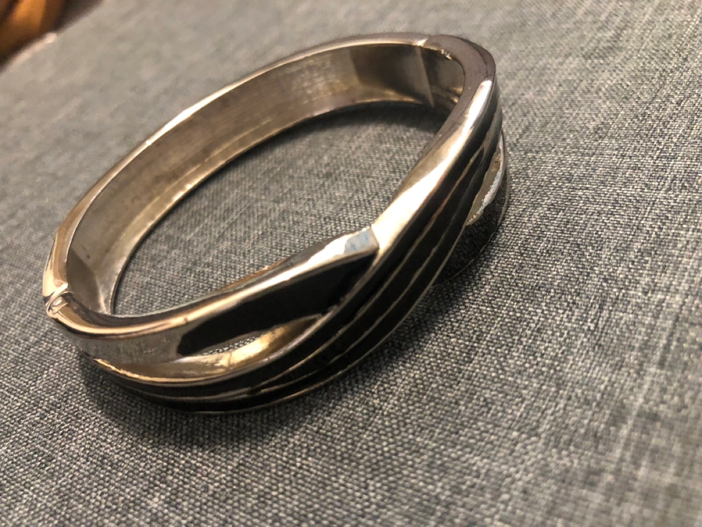 23Silver tone metal hinged bangle bracelet. Features black enamel accents. Unique design.