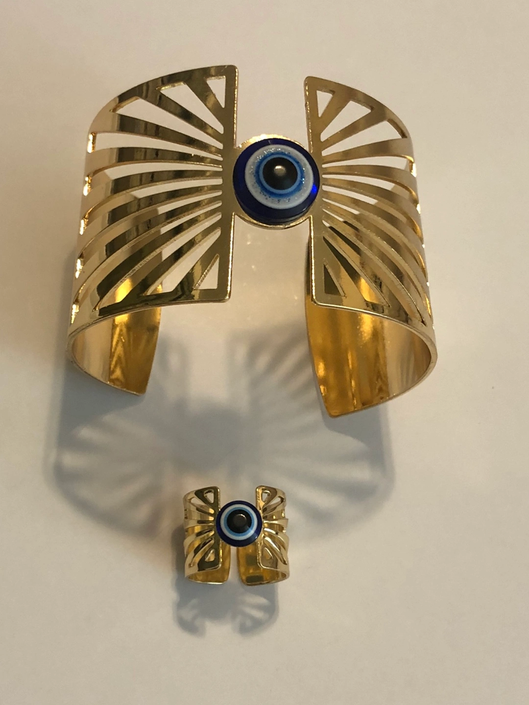 23Stunning gold-tone bracelet and ring set. Features an evil eye charm. Open design. Perfect for layering.