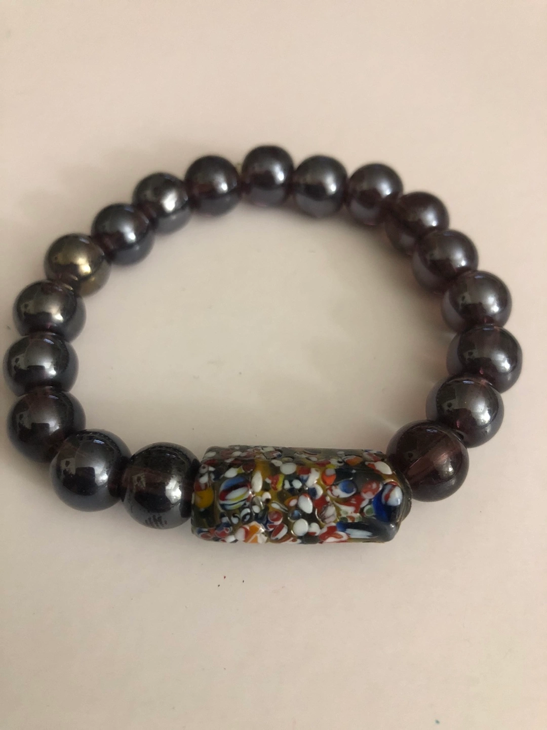 23Stretchy bracelet. Dark gray beads. Colorful millefiori glass focal bead. Unique piece.Handmade