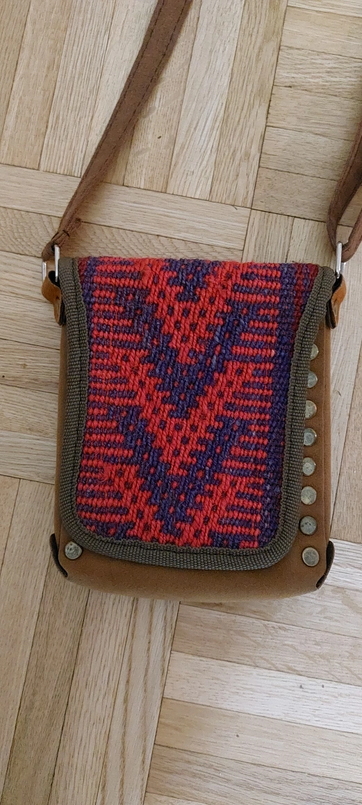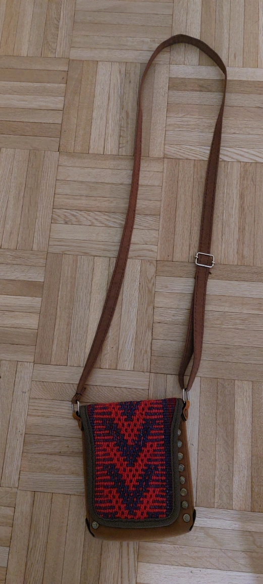 Small crossbody bag. Brown faux leather. Woven front panel red, purple and dark blue. Adjustable strap. Metal studs around the flap. Perfect for everyday use.