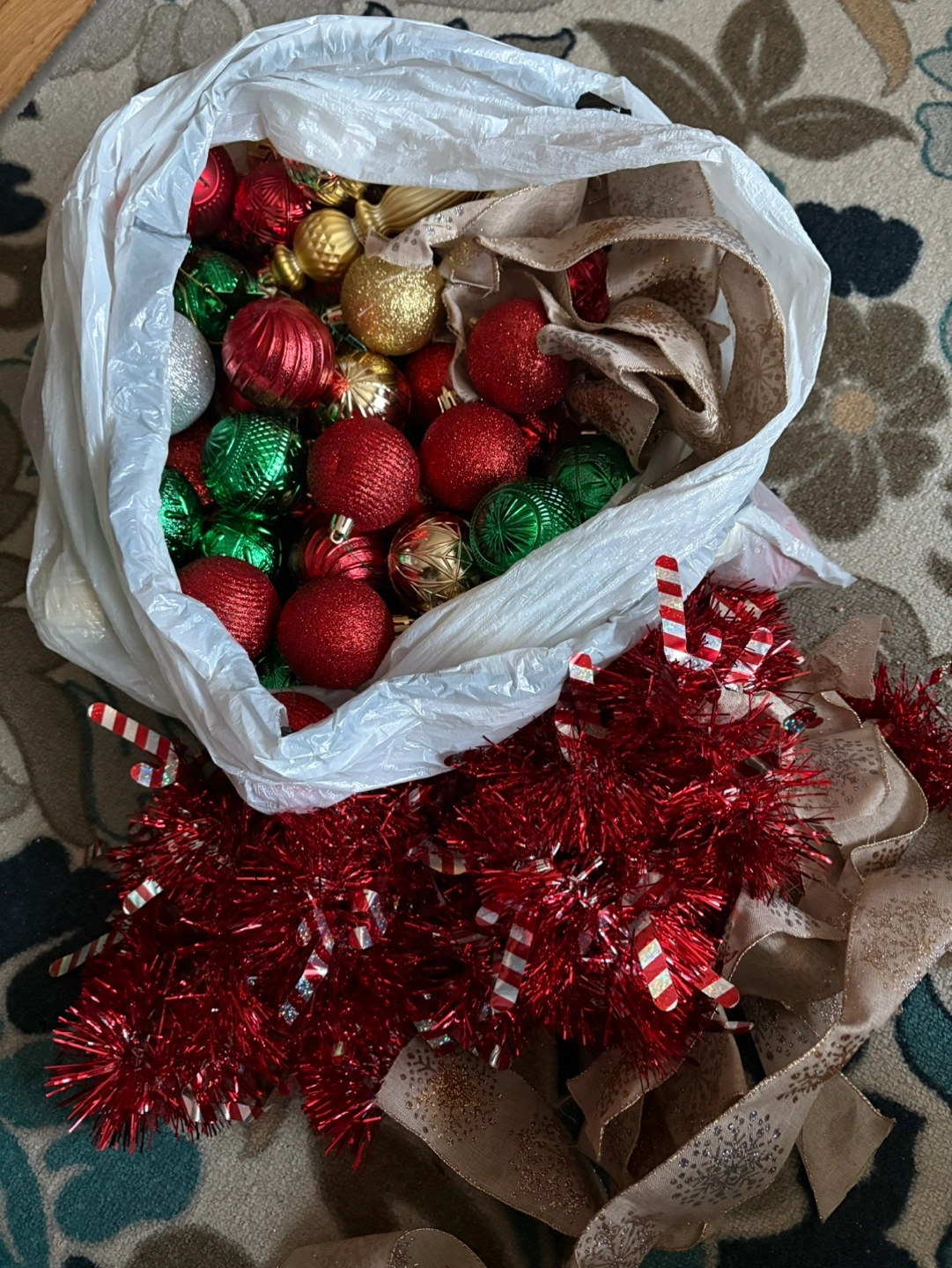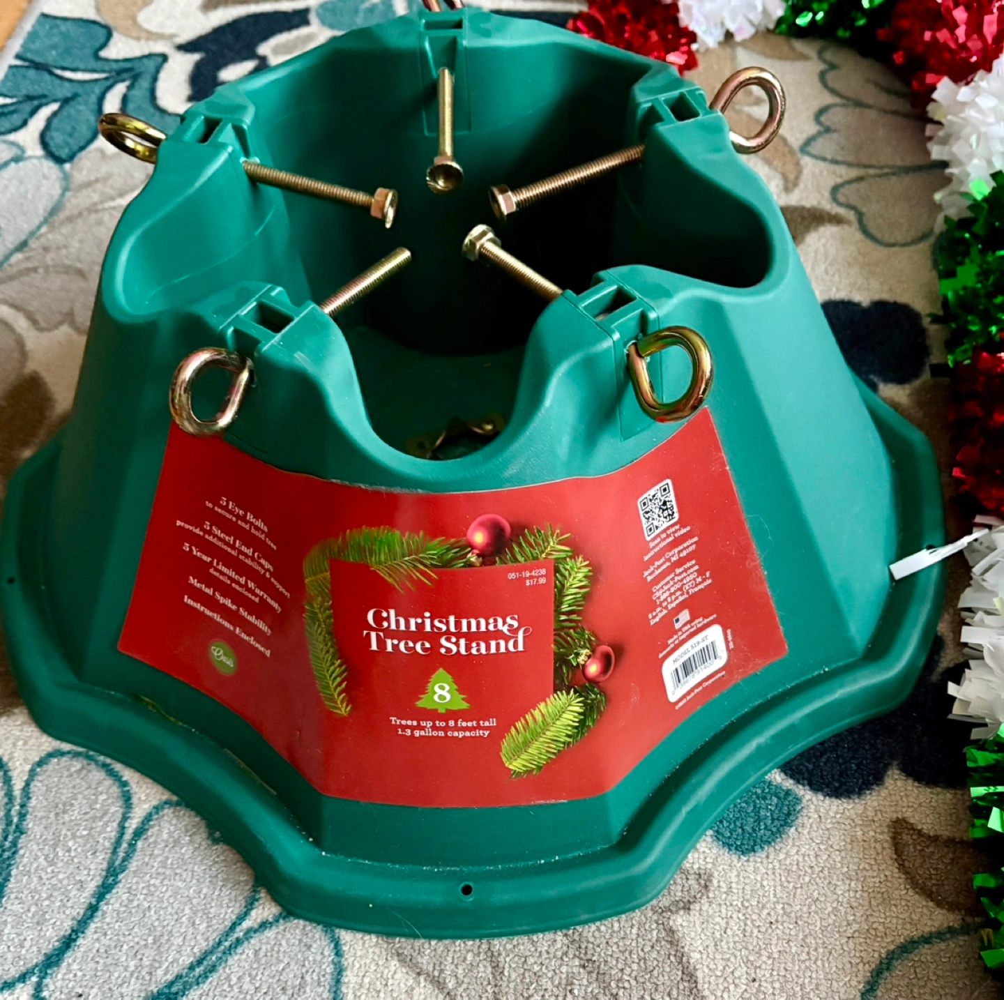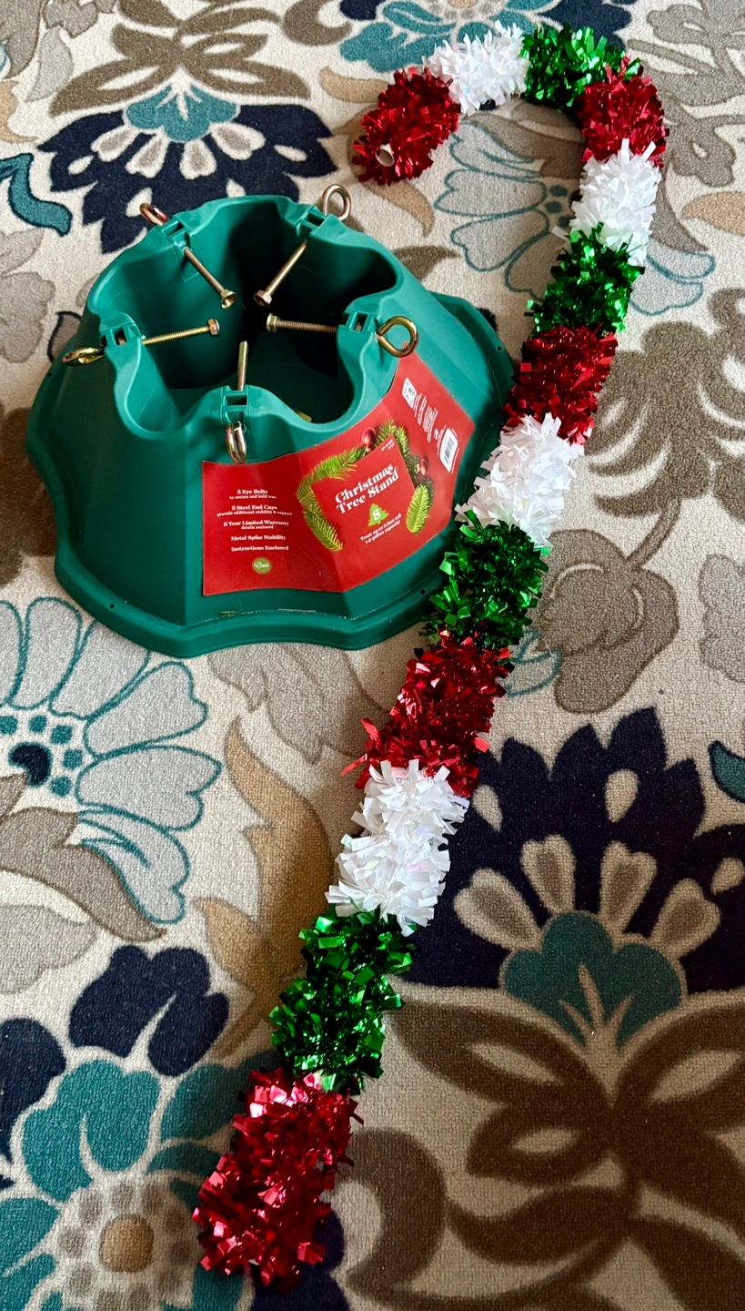 Plastic Christmas tree stand. Holds trees up to 8 feet tall. 1.5 gallon capacity. Includes candy cane and some ornaments with garland . Good condition.