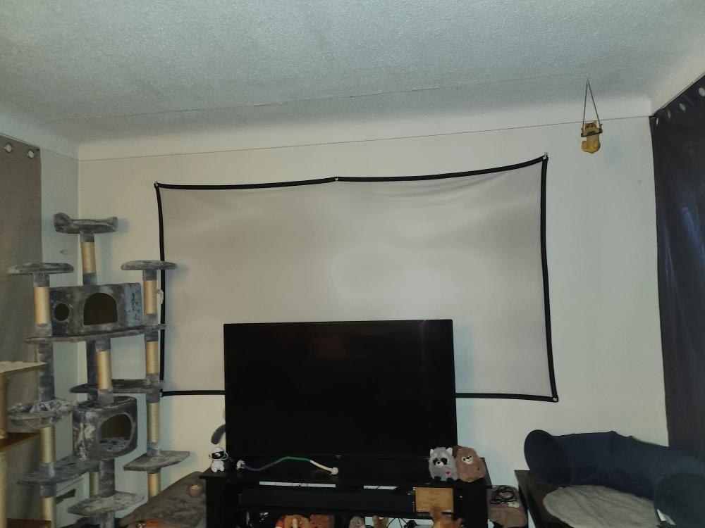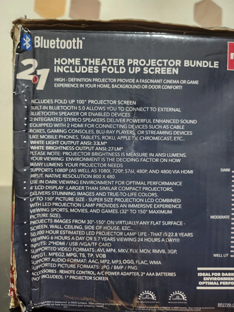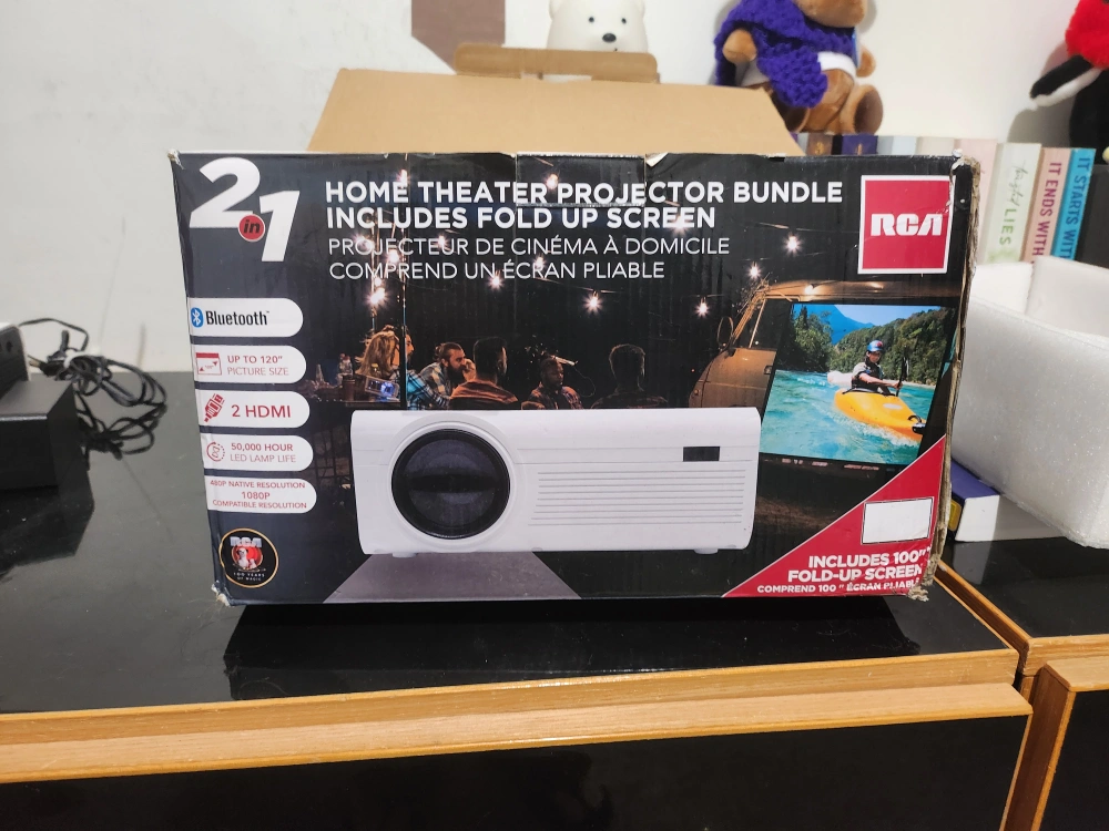 Portable home theatre projector. Includes a foldable screen as shown in picture.