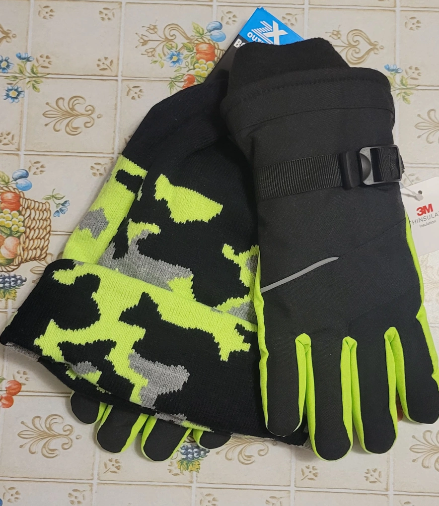 Black and lime green camo beanie and gloves set. Warm and cozy. Features 3M Thinsulate insulation. Adjustable strap on gloves. Size Large/Extra Large.