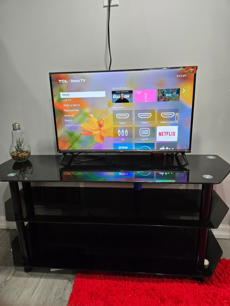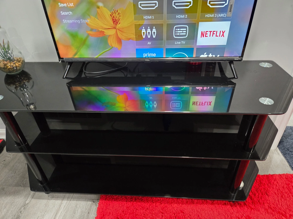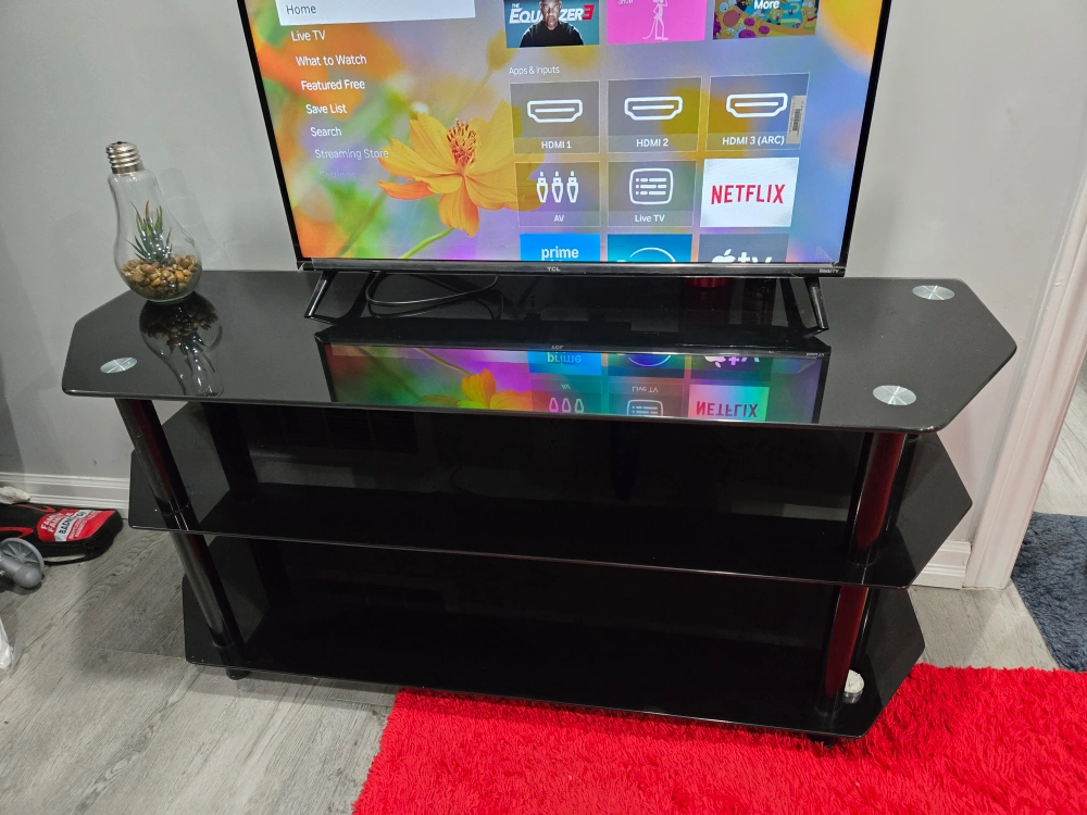 Sleek black glass TV stand. Three shelves offer ample storage. Modern design. Features tempered glass shelves and a sturdy black metal frame. Perfect for TVs.