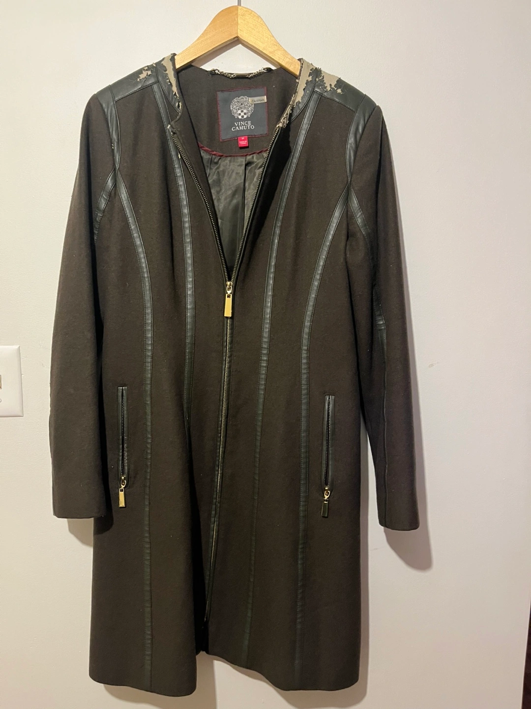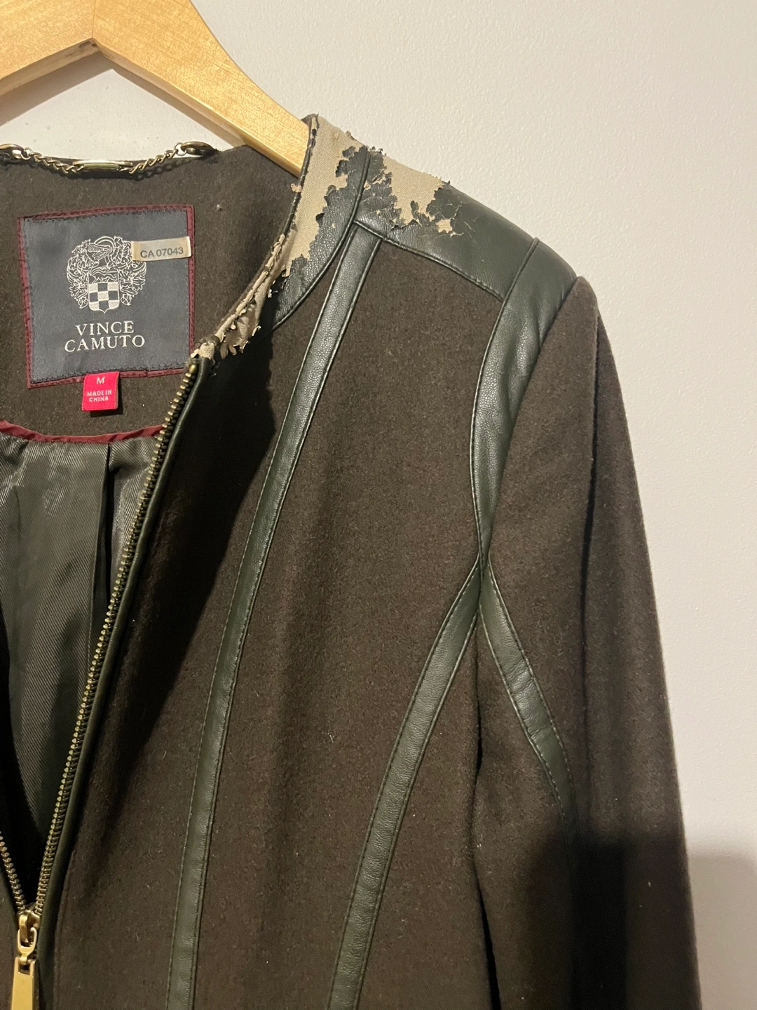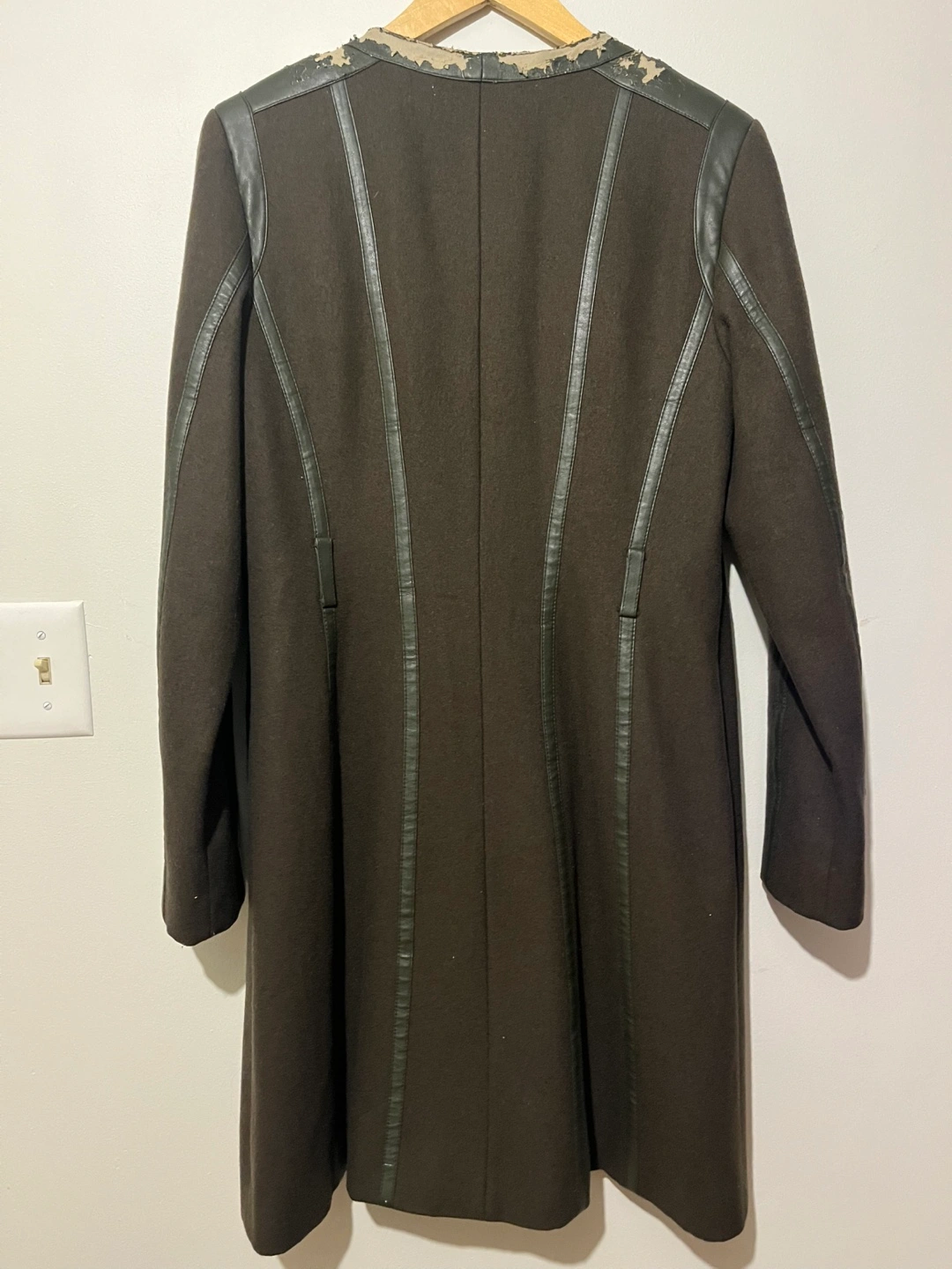 Women's dark Olive /Army green wool coat. Features leather trim and gold zipper. Size medium. Some damage to the collar and tip of shoulder .