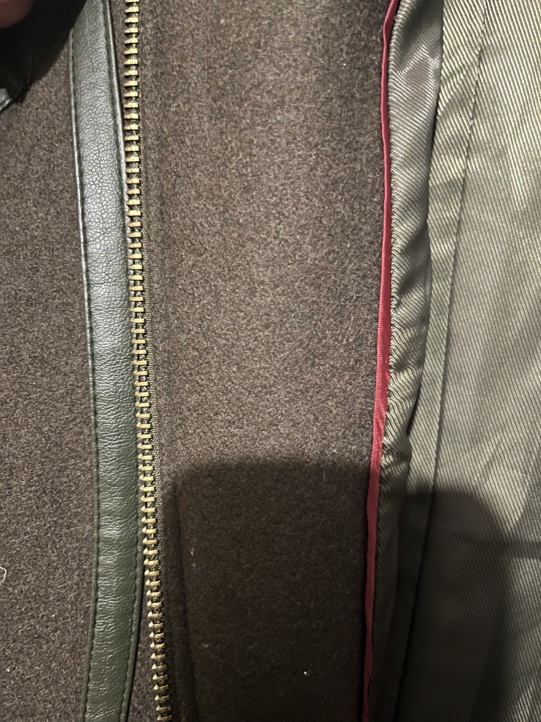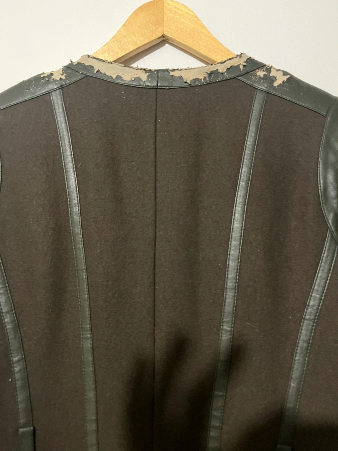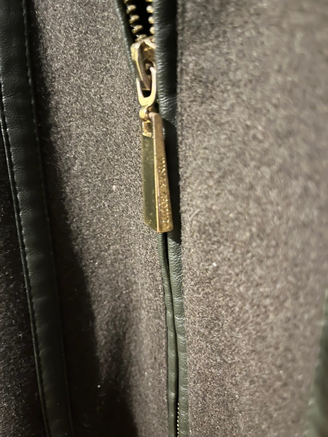 Women's dark Olive /Army green wool coat. Features leather trim and gold zipper. Size medium. Some damage to the collar and tip of shoulder .