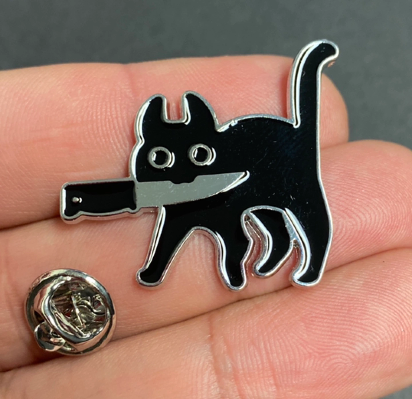 Cute black cat enamel pin. Features a black cat holding a knife. Includes pin backing. Great for bags, jackets, or hats.